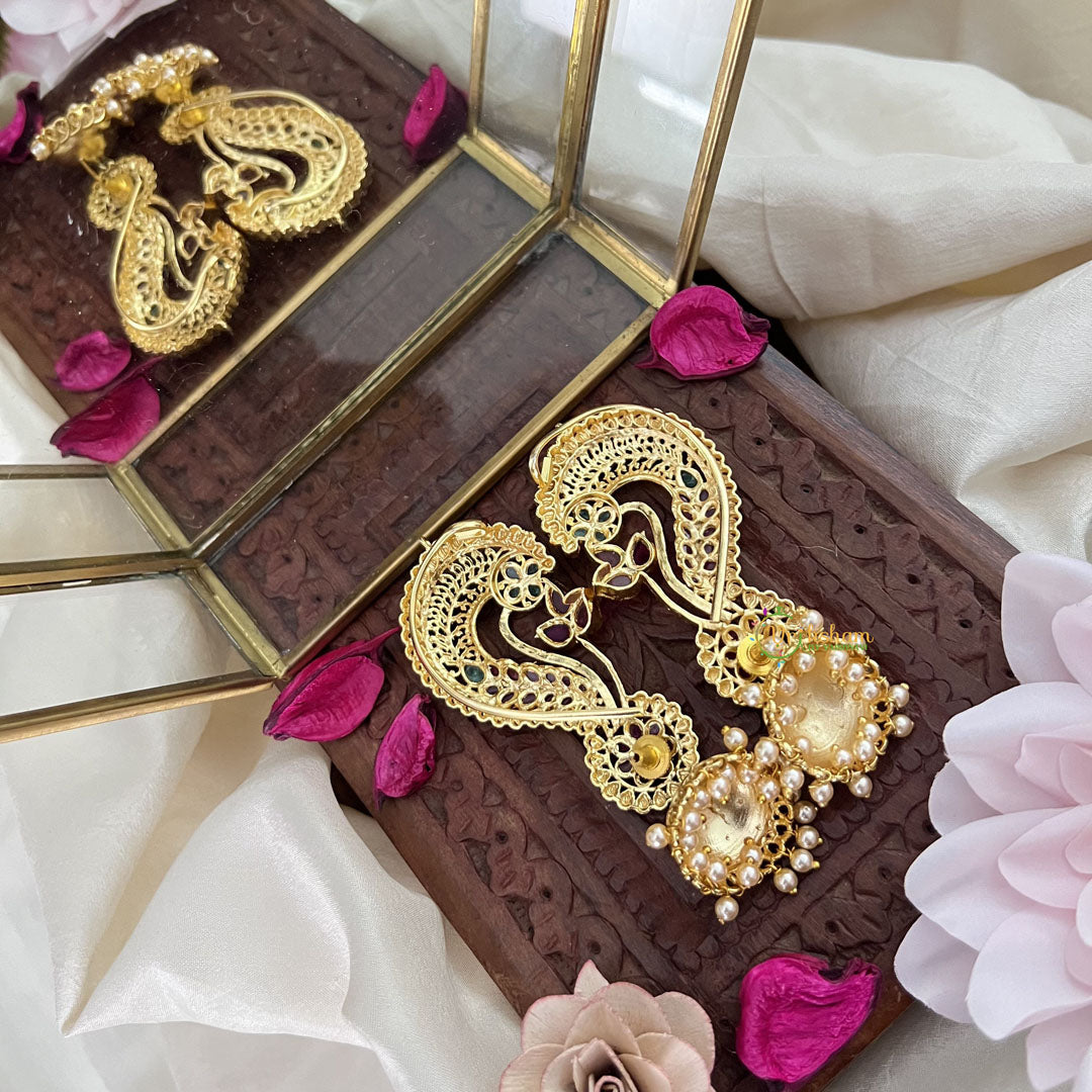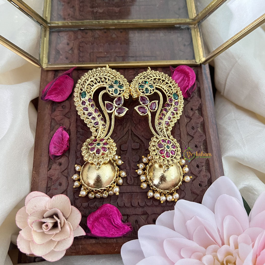 AD Stone Cuff Jhumkas - Red Green peacock designed jhumkas with cuff pattern, complete Red green set jhumkas.