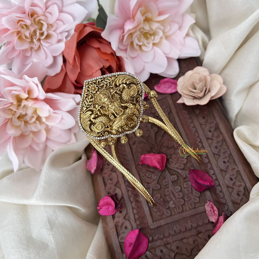 Elevate your style with Vriksham's Ad stone Dual Peacock Vangi, adorned with intricate gold beads and a goddess Lakshmi design. Embody the grace and opulence of peacocks as you don these armlets, perfect for any luxurious occasion.