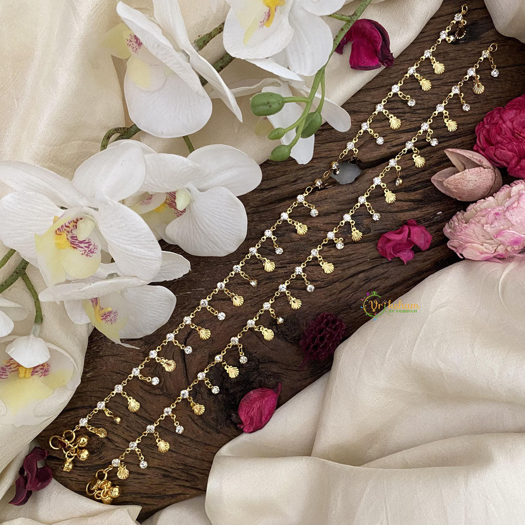 Indulge in a touch of luxury with our Vriksham AD Stone Gold Look Alike Anklets. The intricate design exudes sophistication and exclusivity, elevating any outfit with its elegant charm. Crafted to perfection, these anklets are the perfect addition to your collection.