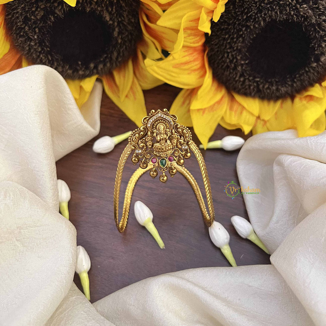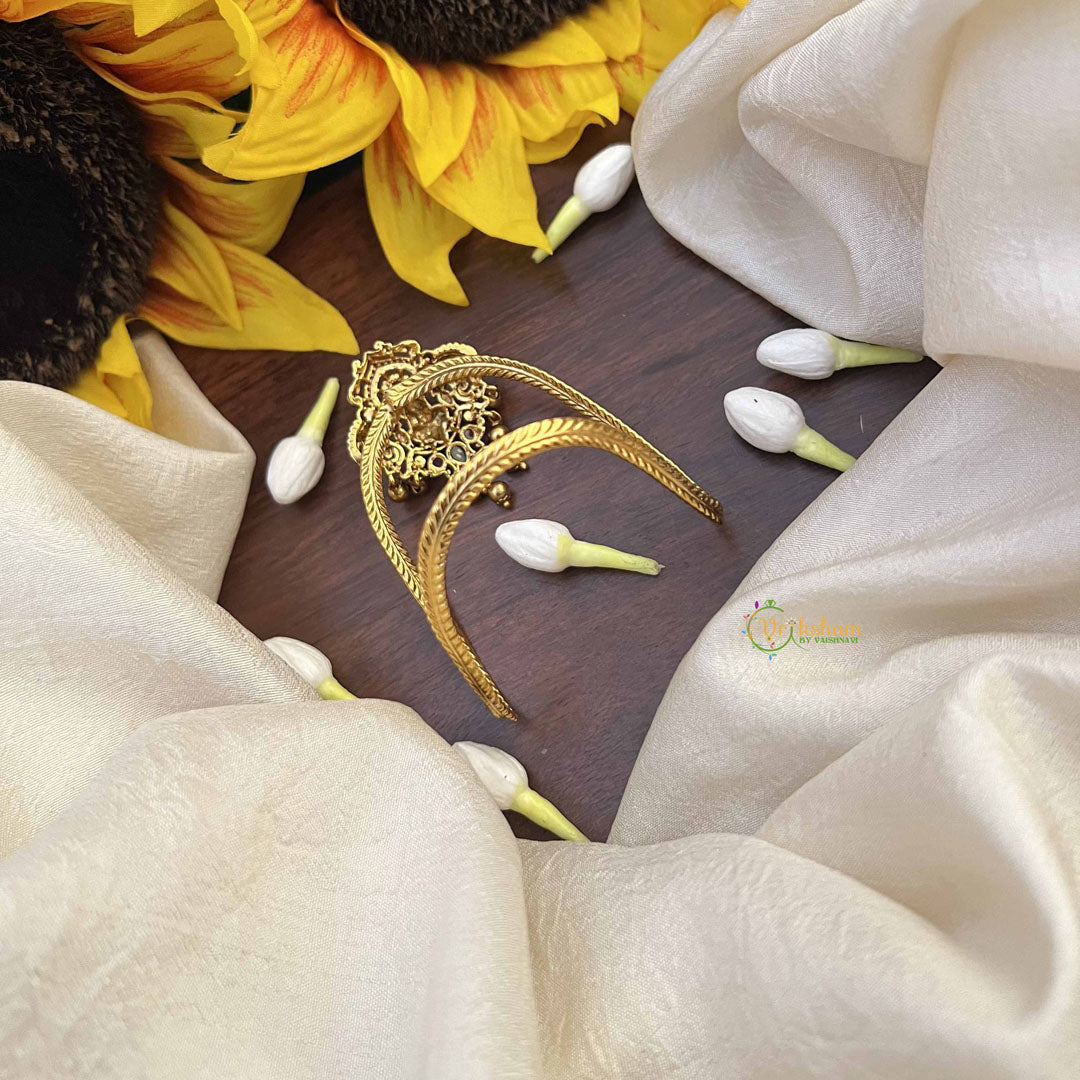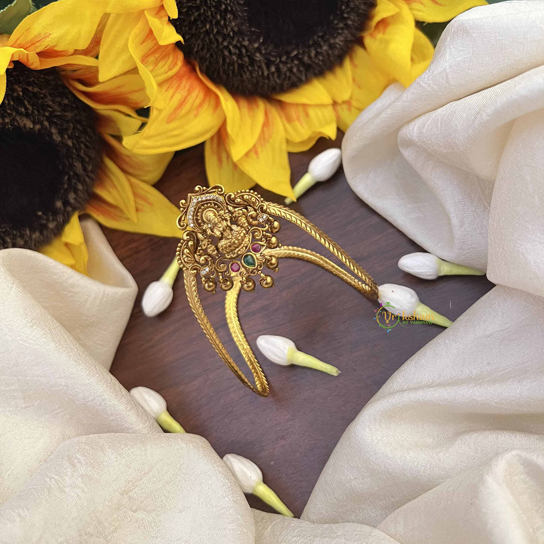 Celebrate prosperity with this AD Stone Lakshmi Vangi Temple Armlet, where luminous gemstone elements honor the goddess of abundance and grace. Premium AD stone creates a radiant foundation for Goddess Lakshmi's serene presence, rendered through authentic temple jewelry craftsmanship. Vibrant green beads symbolize growth, renewal, and the flourishing blessings that Lakshmi bestows upon her devoted followers. The harmonious blend of shimmering AD stone and verdant green accents creates a visually captivating piece that radiates both spiritual significance and refined sophistication. Crafted with meticulous attention to traditional design, this temple armlet serves as a powerful spiritual companion for daily devotion or significant religious celebrations. Perfect for those seeking to invoke Lakshmi's blessings of wealth, health, and divine grace, this sophisticated accessory seamlessly merges cultural authenticity with contemporary elegance. An essential treasure that strengthens your spiritual practice while celebrating timeless artistry, making it an