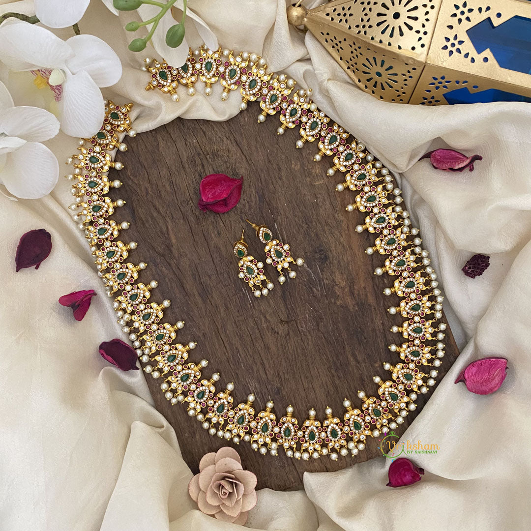 Elevate your look with Vriksham's AD Stone Long Guttapusalu. With stunning red, green, and white accents and a touch of white pearl, this necklace exudes elegance and luxury. Perfect for any occasion, add a touch of sophistication to your outfit. Elevate your style with Vriksham.