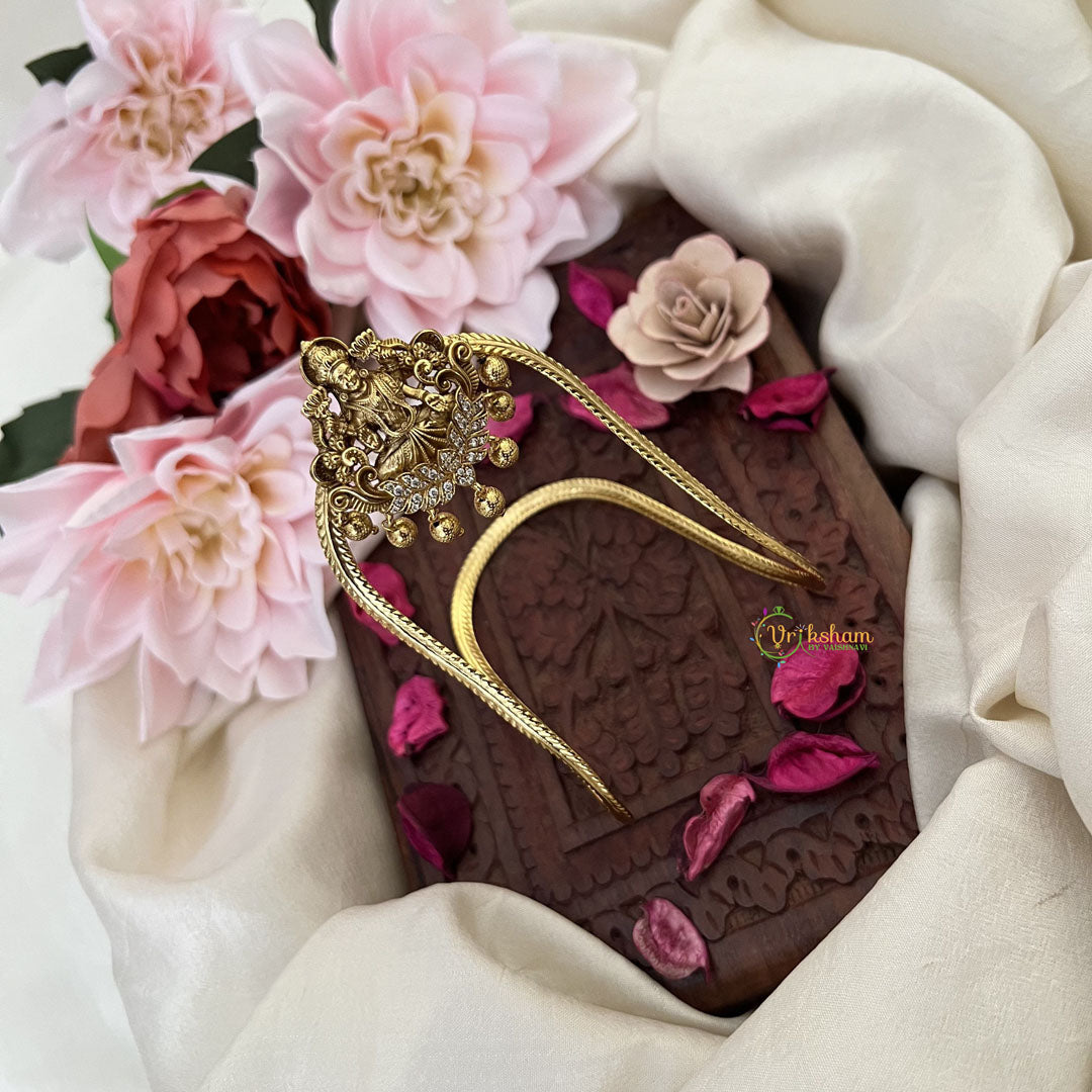 Introducing the Vriksham Ad Stone Lotus Lakshmi Vangi, adorned with delicate gold beads. This armlet exudes elegance and sophistication, making it the perfect addition to any outfit. Channel the allure and grace of the lotus as you don this luxurious piece of art.