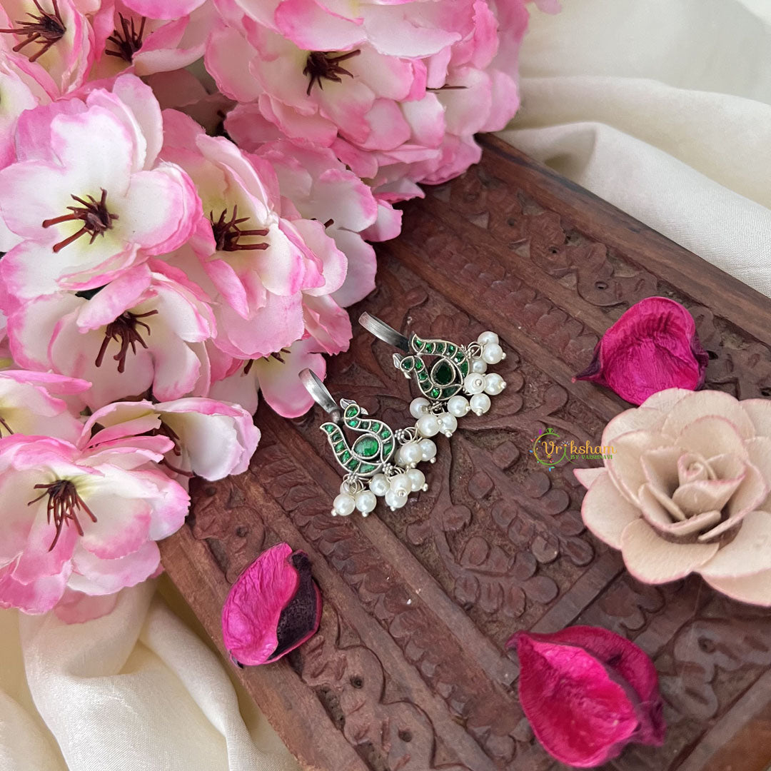 Immerse yourself in cultural elegance with our Annam Style Maharashtrian Press Bugadi. The enchanting interplay of tranquil green and pristine white beads creates a statement piece that honors tradition while embracing refined aesthetics. Expertly crafted with attention to detail, this distinctive ear ornament captures the essence of Maharashtrian heritage. The symbolic Annam design element adds depth and meaning, making this accessory an exquisite choice for celebrations, traditional ceremonies, or whenever you wish to elevate your ensemble with sophisticated cultural artistry.