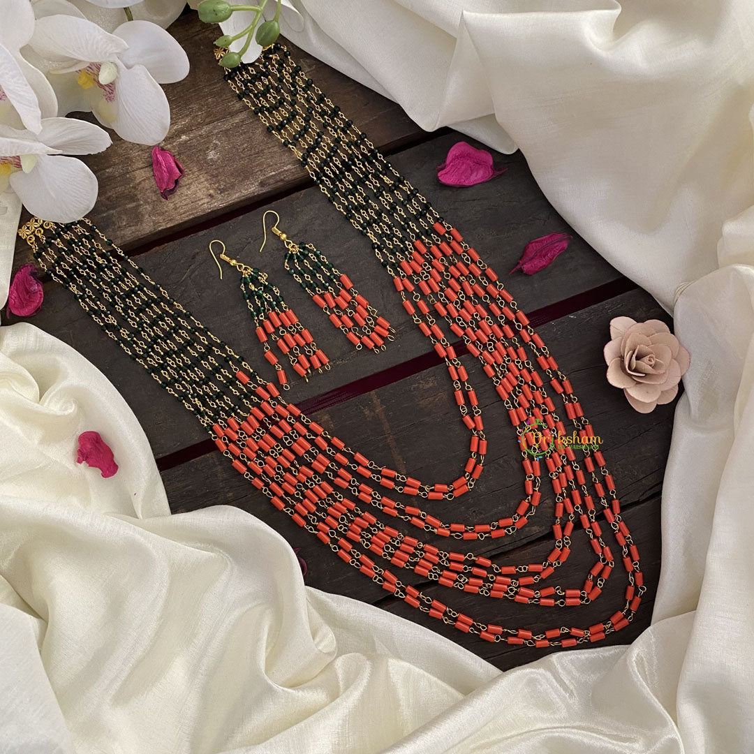 Introducing Vriksham's Antique 10 layer Coral Bead & Dark Green Pearl Mala, a masterpiece of elegance and luxury. With its intricate layers of coral beads and dark green pearls, this mala exudes sophistication and refinement. Elevate your style and channel the world of art and fashion with Vriksham.