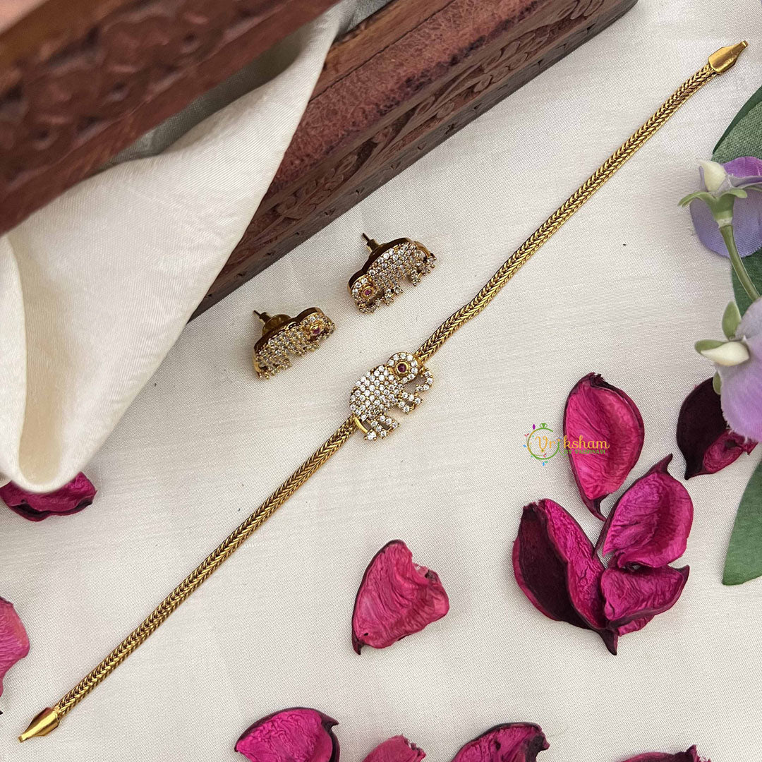 The Vriksham Antique AD Stone Elephant choker showcases intricate craftsmanship with its striking red hues and detailed elephant motif. This short neckpiece combines timeless elegance with cultural symbolism, making it a sophisticated statement piece for special occasions and refined ensembles.