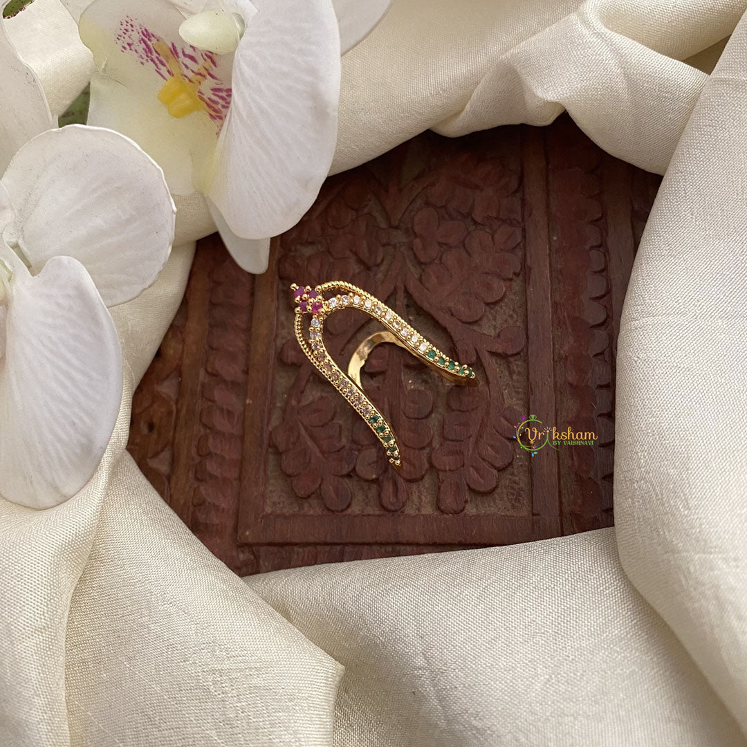 Introducing the Vriksham Antique AD Stone Gold Look Alike Vangi Ring, a perfect blend of elegance and luxury. This stunning ring features intricate red, green, and white stones, exquisitely crafted to resemble shining gold. Elevate your style with this exclusive piece, inspired by the opulence of ancient jewelry.