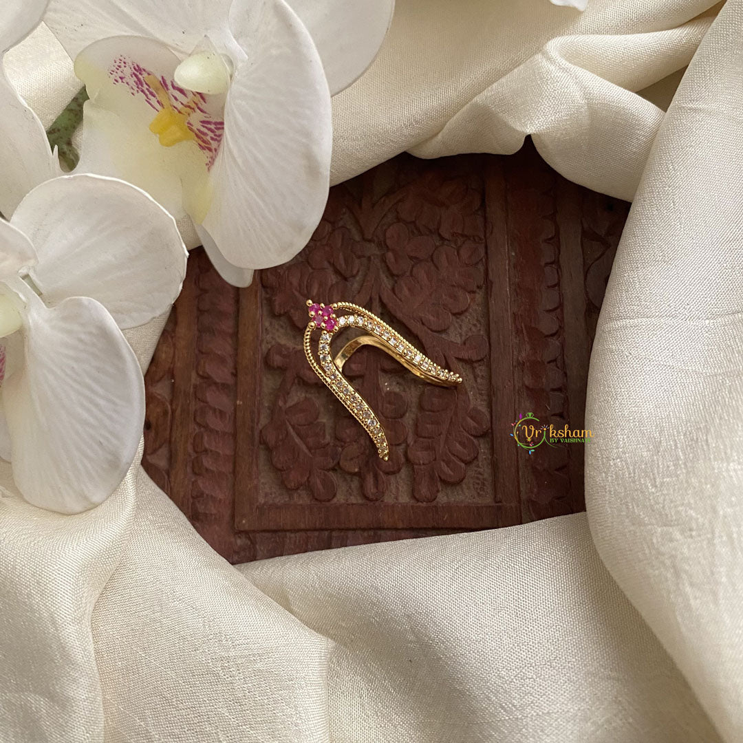 Introducing the Vriksham Antique AD Stone Gold Look Alike Vangi Ring, a perfect blend of elegance and luxury. This stunning ring features intricate red and white stones, exquisitely crafted to resemble shining gold. Elevate your style with this exclusive piece, inspired by the opulence of ancient jewelry.
