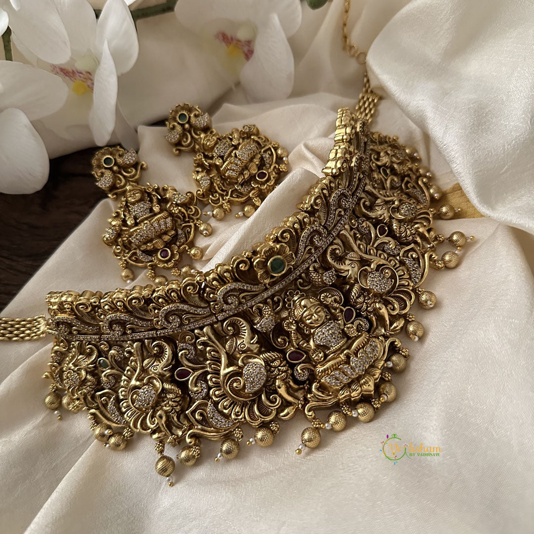 This exquisite Vriksham Antique AD Stone Lakshmi High Neck Choker boasts stunning peacock embellishments and a luxurious gold bead. Channeling the grace and beauty of the goddess Lakshmi, this piece is a must-have for those seeking elevated elegance and sophistication. Elevate your look with this premium choker.