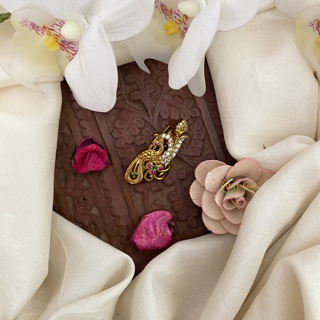 Elevate your saree game with the exquisite Vriksham Antique AD Stone Saree Pin featuring a beautifully adorned peacock design. Made with premium quality materials, this pin adds a touch of luxury and elegance to your ensemble. Shine bright like a peacock and stand out in any occasion.