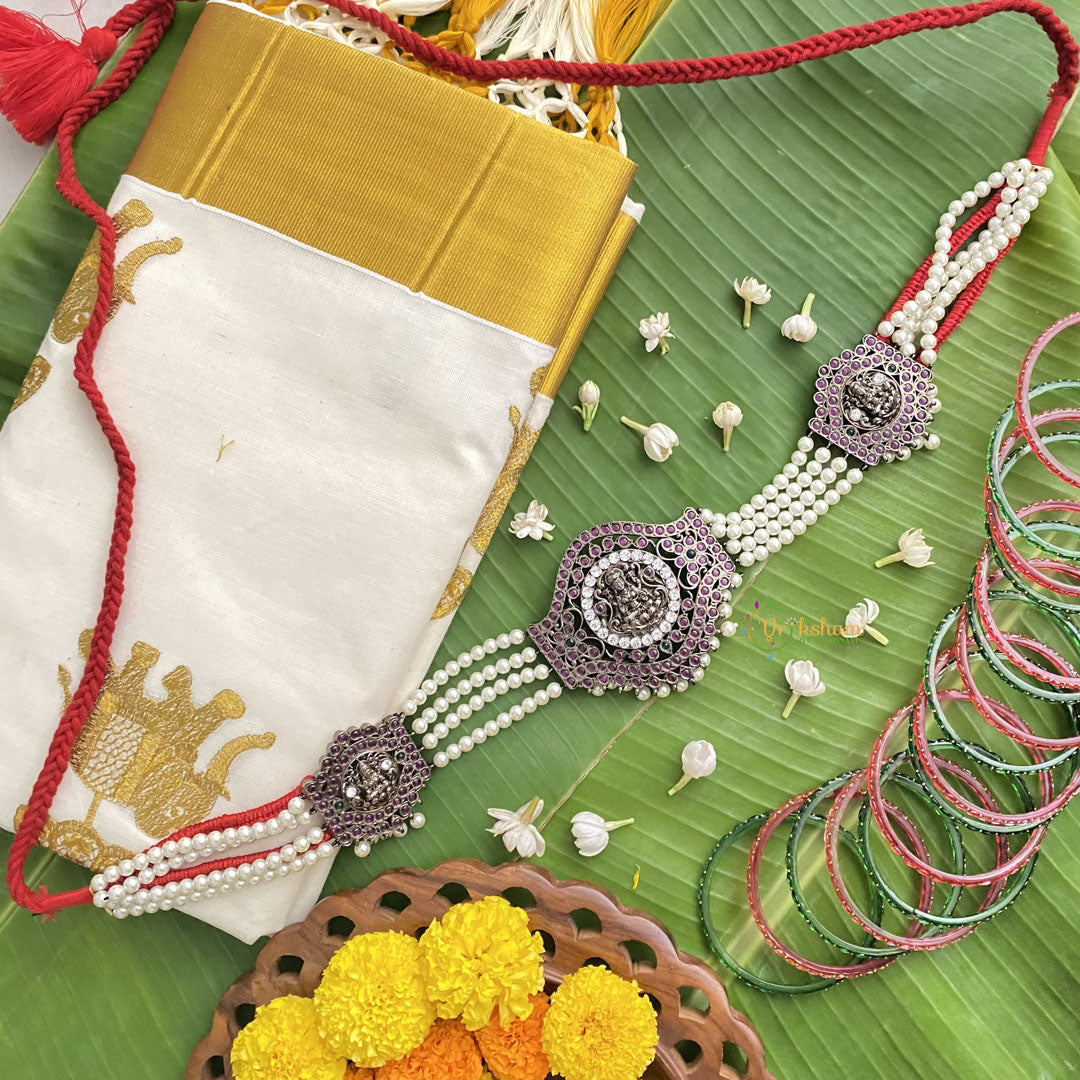 Elevate your style with our Vriksham Antique Black Polish Hip Chain. Crafted with precious Kemp pearls, this traditional piece exudes exclusivity and elegance. Perfect for adding a touch of sophistication to any outfit. Upgrade your accessory game with this one-of-a-kind treasure.