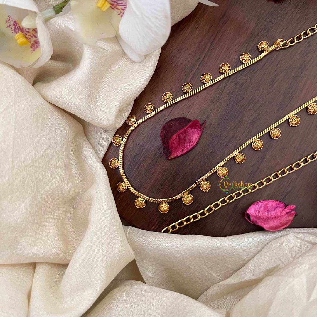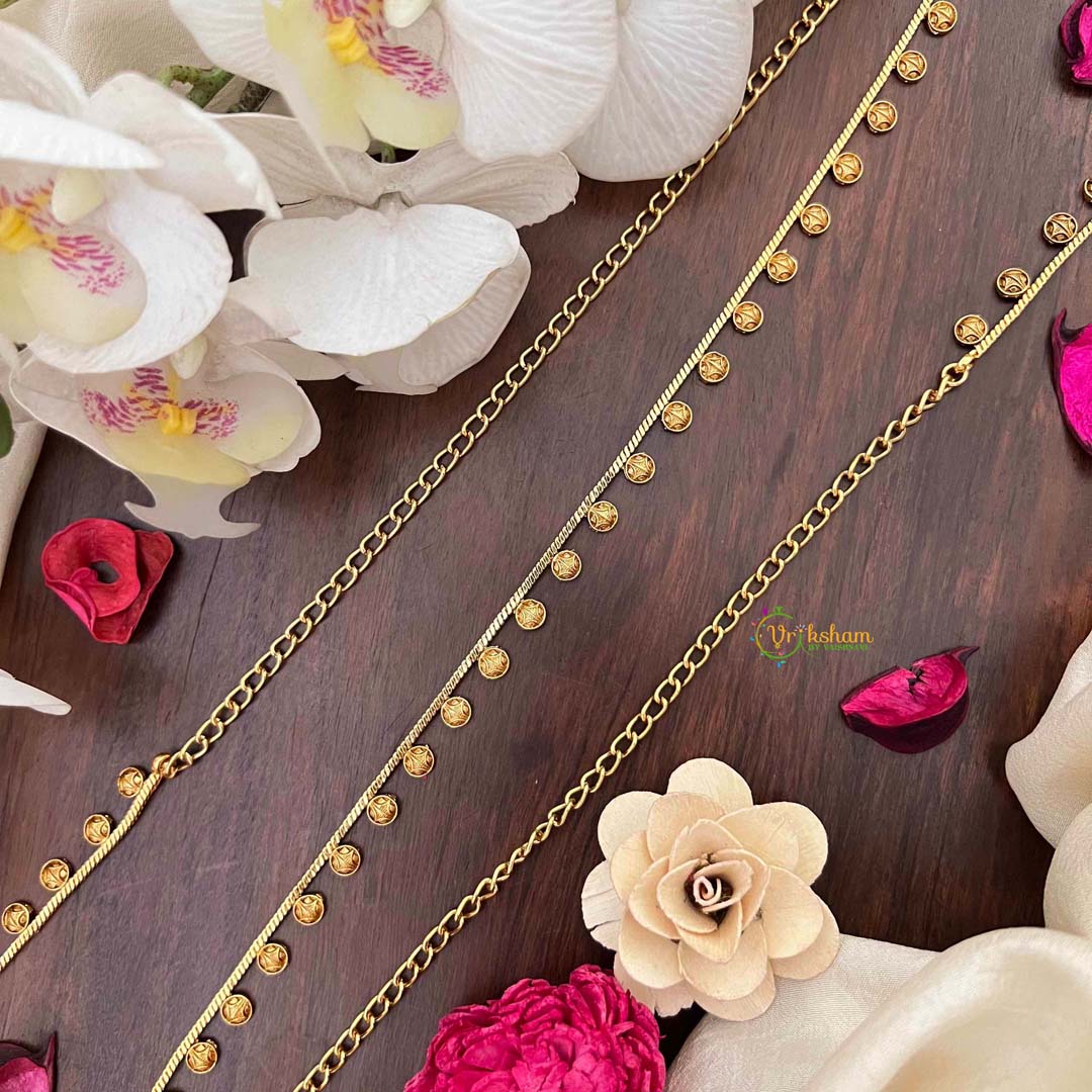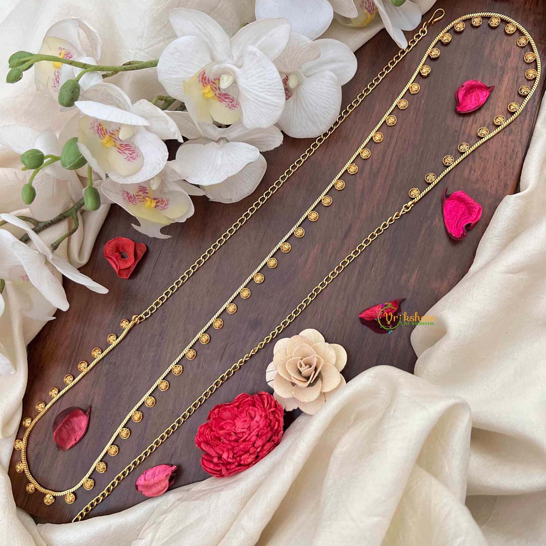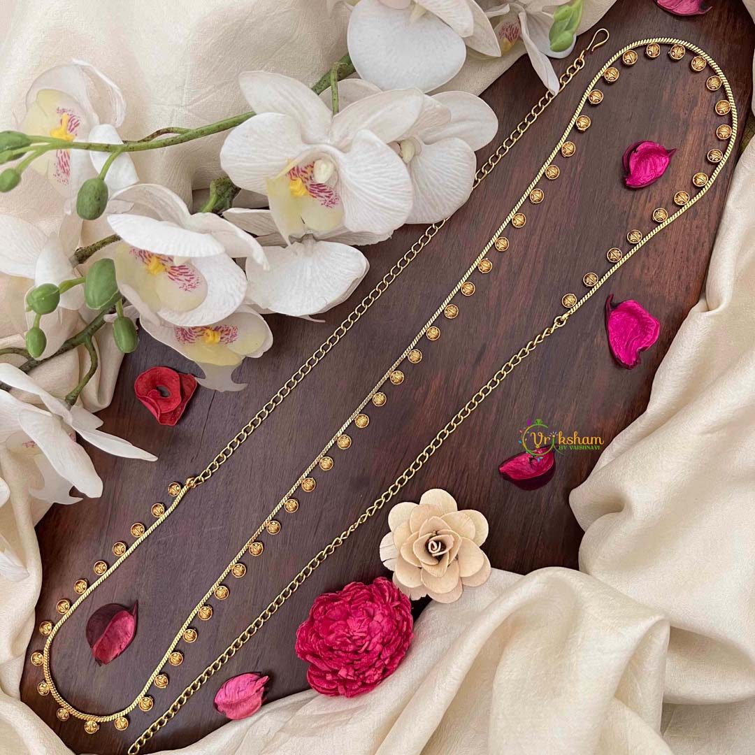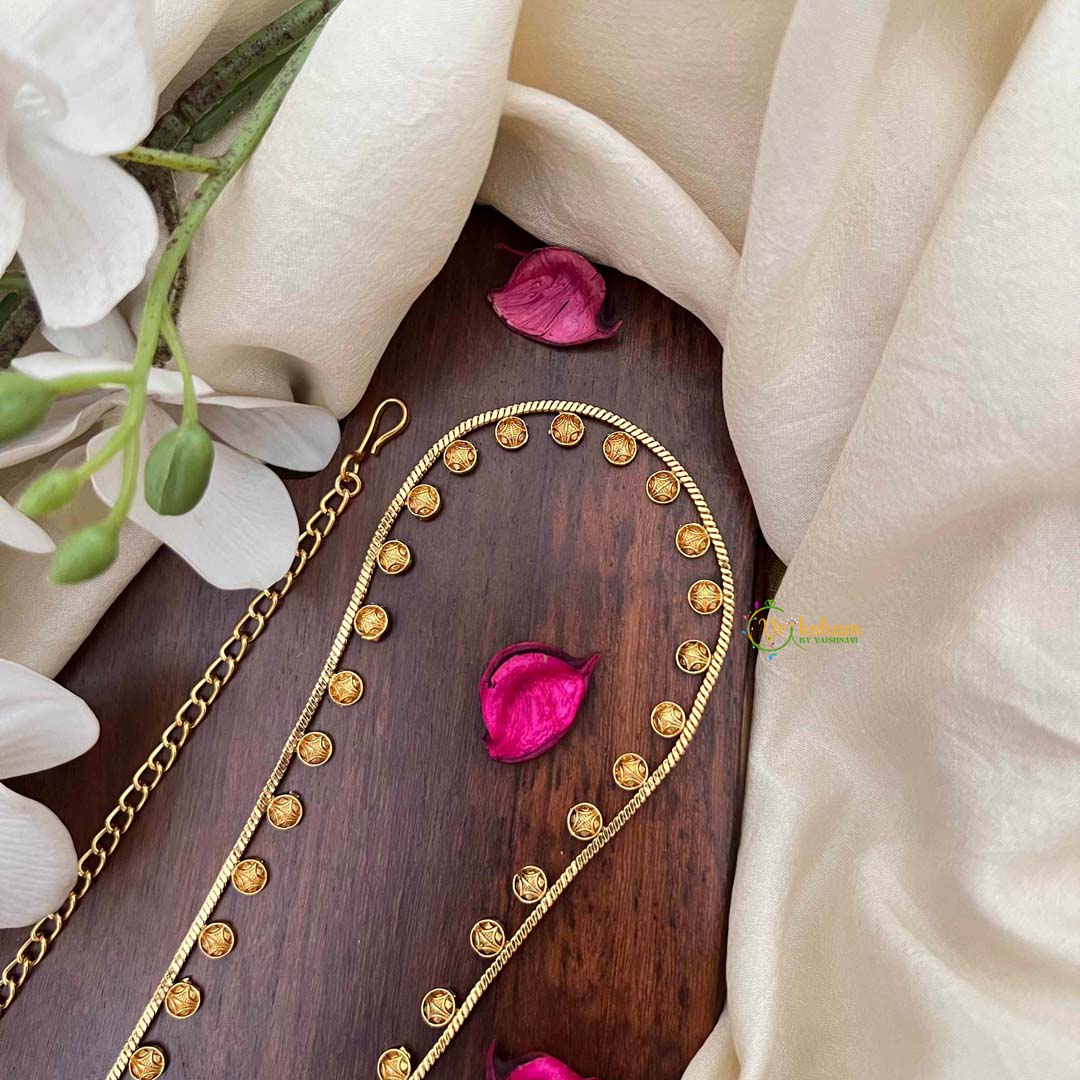 Embrace timeless elegance with this distinguished hip chain, showcasing circular cutwork patterns that evoke vintage charm with contemporary polish. The antique-inspired gold finish lends an air of heritage sophistication, while the geometric precision of each circular motif demonstrates exceptional craftsmanship. This refined accessory seamlessly complements traditional ensembles, adding depth and character to festive occasions and celebrations. The interplay of light across the cutwork creates a captivating visual effect, making it an ideal choice for those who value classic aesthetics and artisanal quality. A versatile statement piece that transcends seasons and trends.