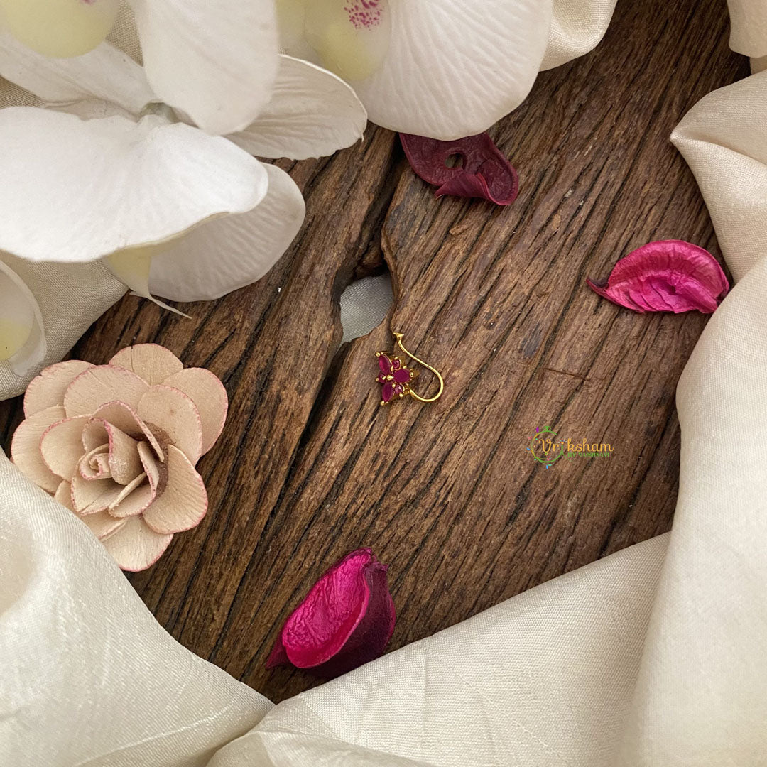Elevate your style with our Vriksham Antique Designer AD Stone Nath/Nose pin in vibrant red. This elegant piece features intricate design and sparkling stones, exuding luxury and sophistication. Upgrade your fashion game with this tasteful and exclusive accessory.
