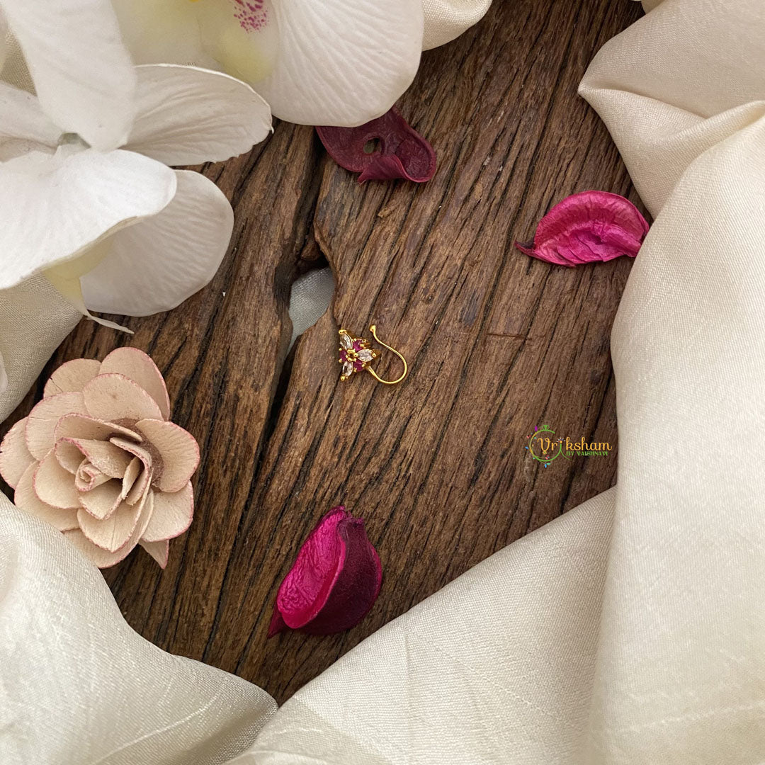 Elevate your style with our Vriksham Antique Designer AD Stone Nath/Nose pin in vibrant red white. This elegant piece features intricate design and sparkling stones, exuding luxury and sophistication. Upgrade your fashion game with this tasteful and exclusive accessory.