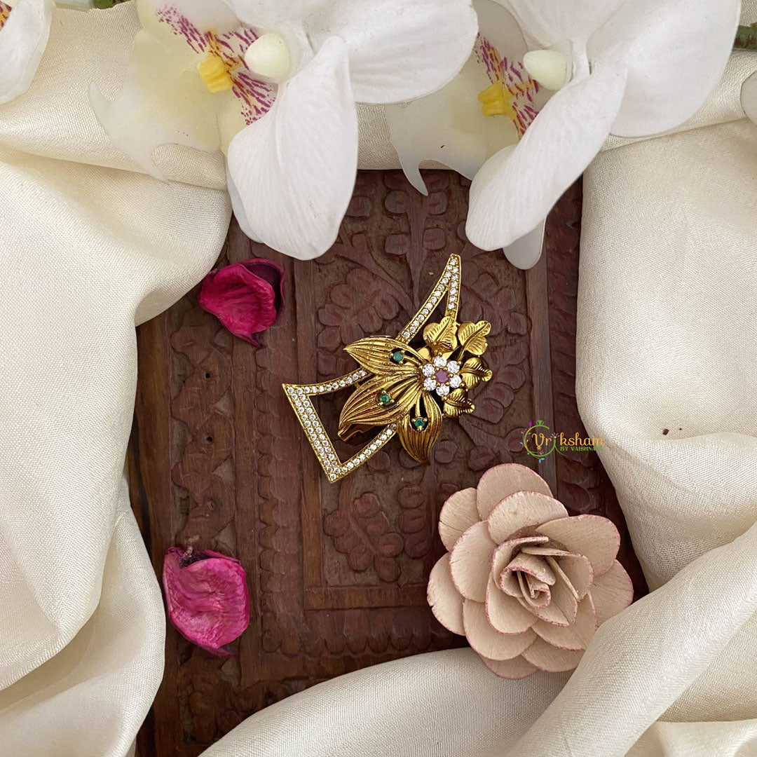 Elevate any saree with the Vriksham Antique Designer AD Stone Saree Pin. This intricately designed pin, adorned with luxurious AD stones, adds an elegant touch to your outfit. Perfect for special occasions, this saree pin will make you stand out with its unique and sophisticated style.