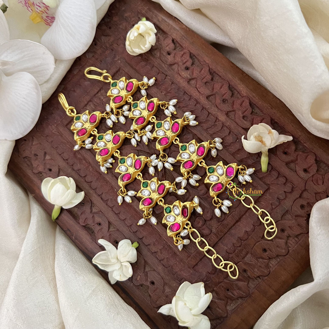 The Vriksham Antique Designer Kundan Jadau Single Strand Maatil showcases timeless elegance with its intricate kundan and jadau craftsmanship, beautifully accented by lustrous rice pearls. This sophisticated piece reflects classic artistry, making it a perfect statement necklace for those who appreciate heritage-inspired luxury.