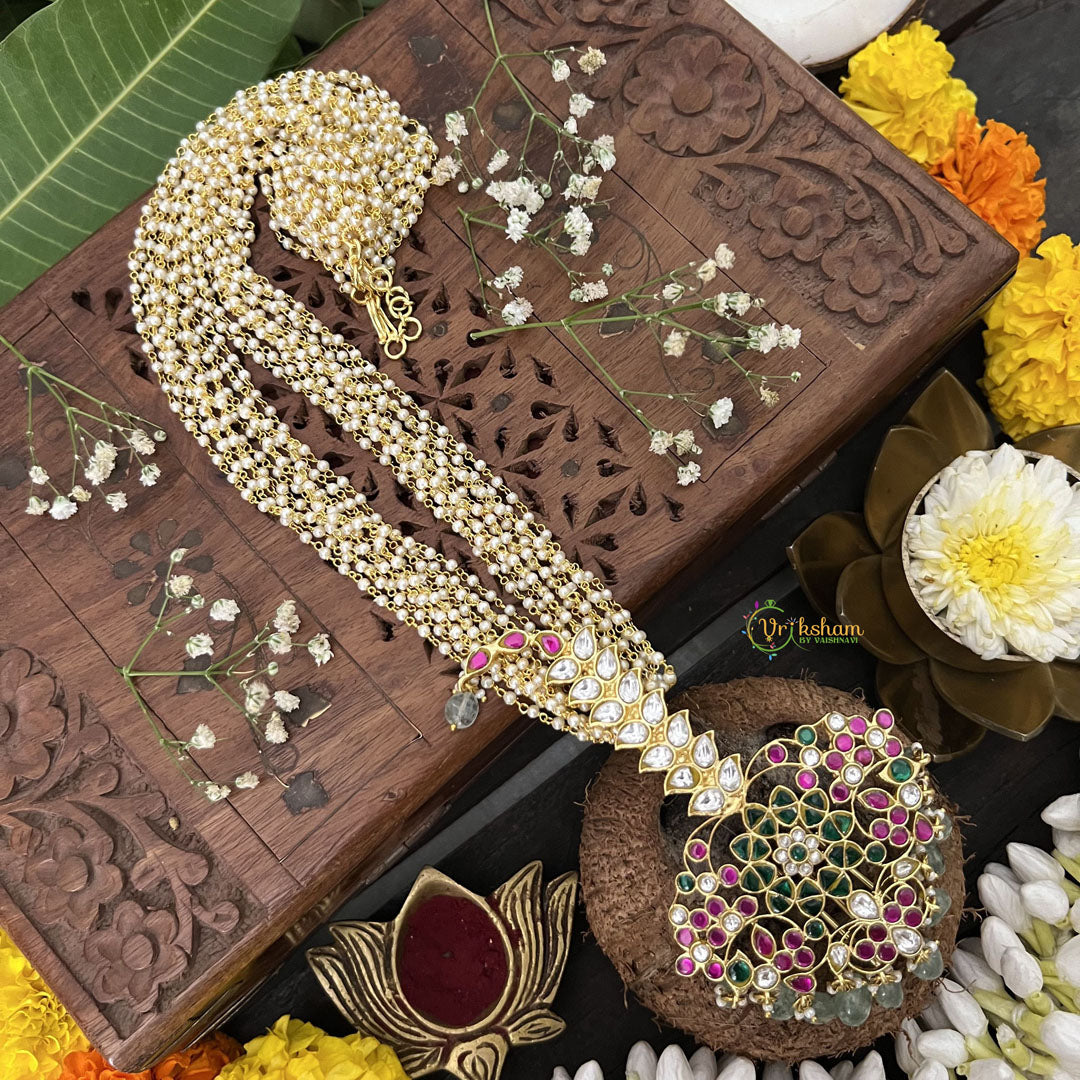 The Vriksham Antique Designer Pendant Jadau Kundan 10 Layered Mala with aqua green beads is a stunning statement piece that combines intricate craftsmanship with vibrant elegance. Featuring a beautifully detailed pendant and multiple layers of beads, this sophisticated necklace adds depth and a regal touch to your traditional attire, perfect for making a lasting impression at special occasions.