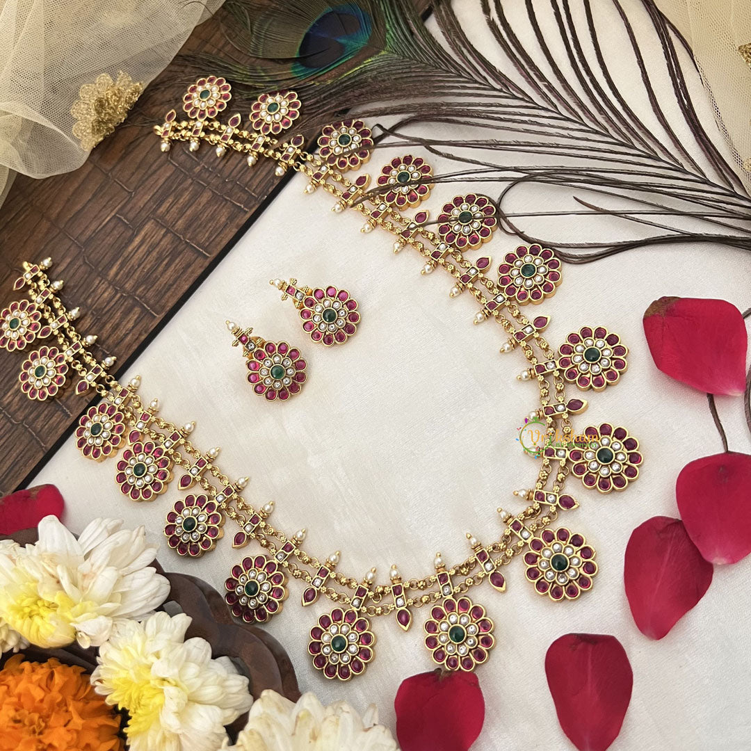Elevate your elegance with the Vriksham Antique Finish Gold Round Floral Long Neckpiece. This exquisite piece features a timeless floral design with a rich antique gold finish, perfect for adding a refined touch to any ensemble. Its long silhouette gracefully enhances your neckline, making it ideal for both traditional occasions and sophisticated gatherings. Crafted to blend classic charm with contemporary style, this neckpiece is a statement of enduring beauty and grace.