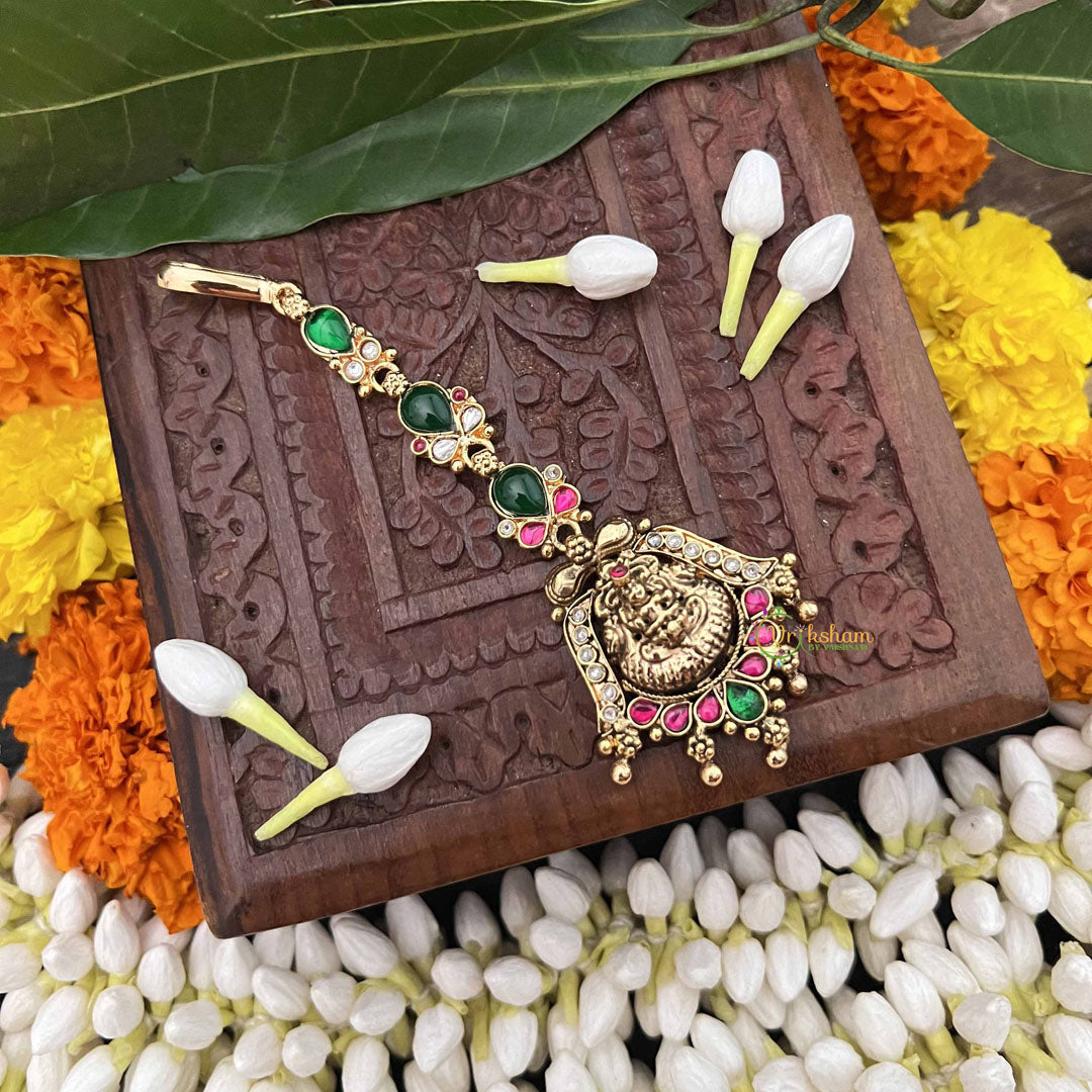 The Vriksham Antique Finish Lakshmi Green Pear 1 Gram Gold Maang Tikka features a beautifully detailed Lakshmi motif enhanced with a striking green pear-shaped stone. Crafted with an antique gold finish, this lightweight accessory offers a sophisticated and elegant accent for bridal and traditional hairstyles, blending heritage with timeless charm.