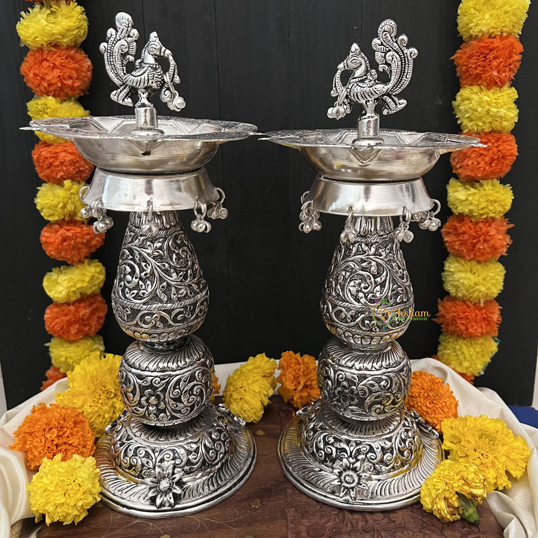 Elevate your puja rituals with the Vriksham Antique Oxidized Silver Traditional Lamp set. Crafted with exquisite oxidized silver finish, these lamps blend timeless tradition with refined elegance. Perfectly designed for spiritual ceremonies, each lamp radiates a warm, serene glow, enhancing the sacred ambiance. This set of two offers both beauty and functionality, making it an essential addition to your devotional space.