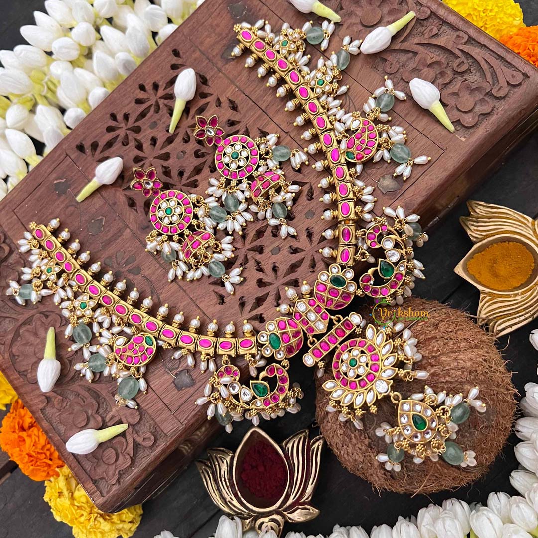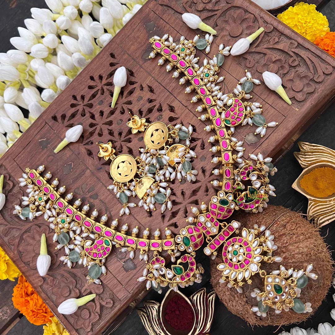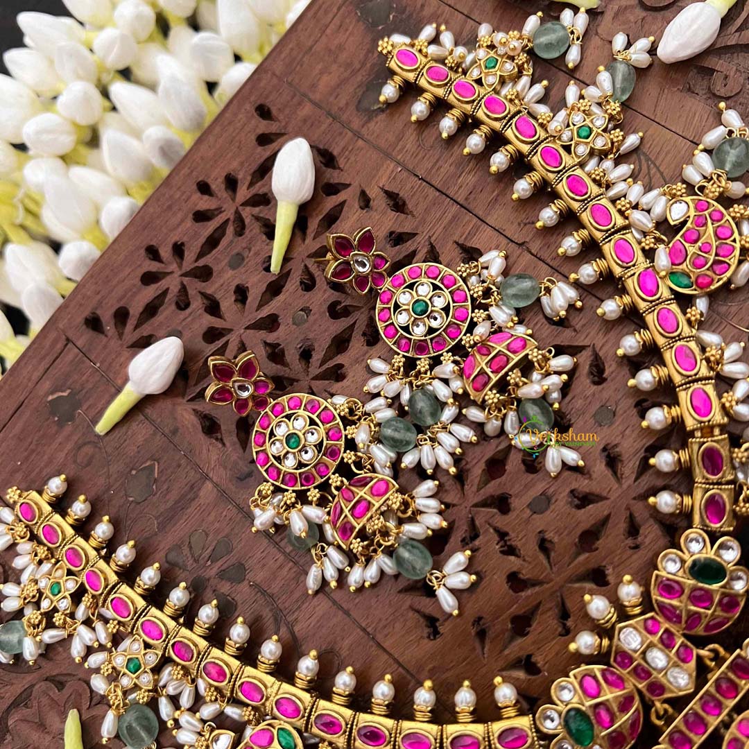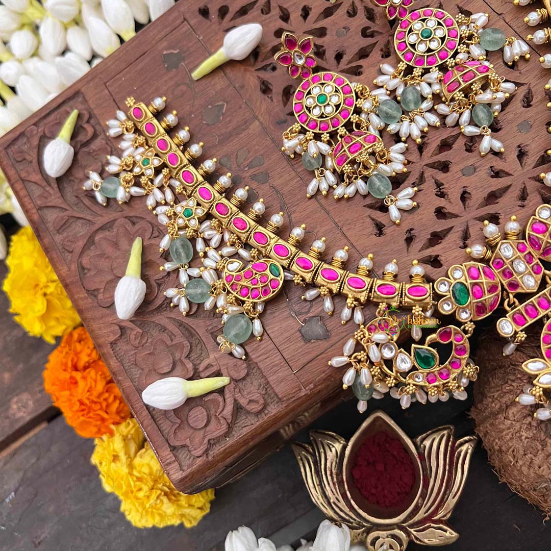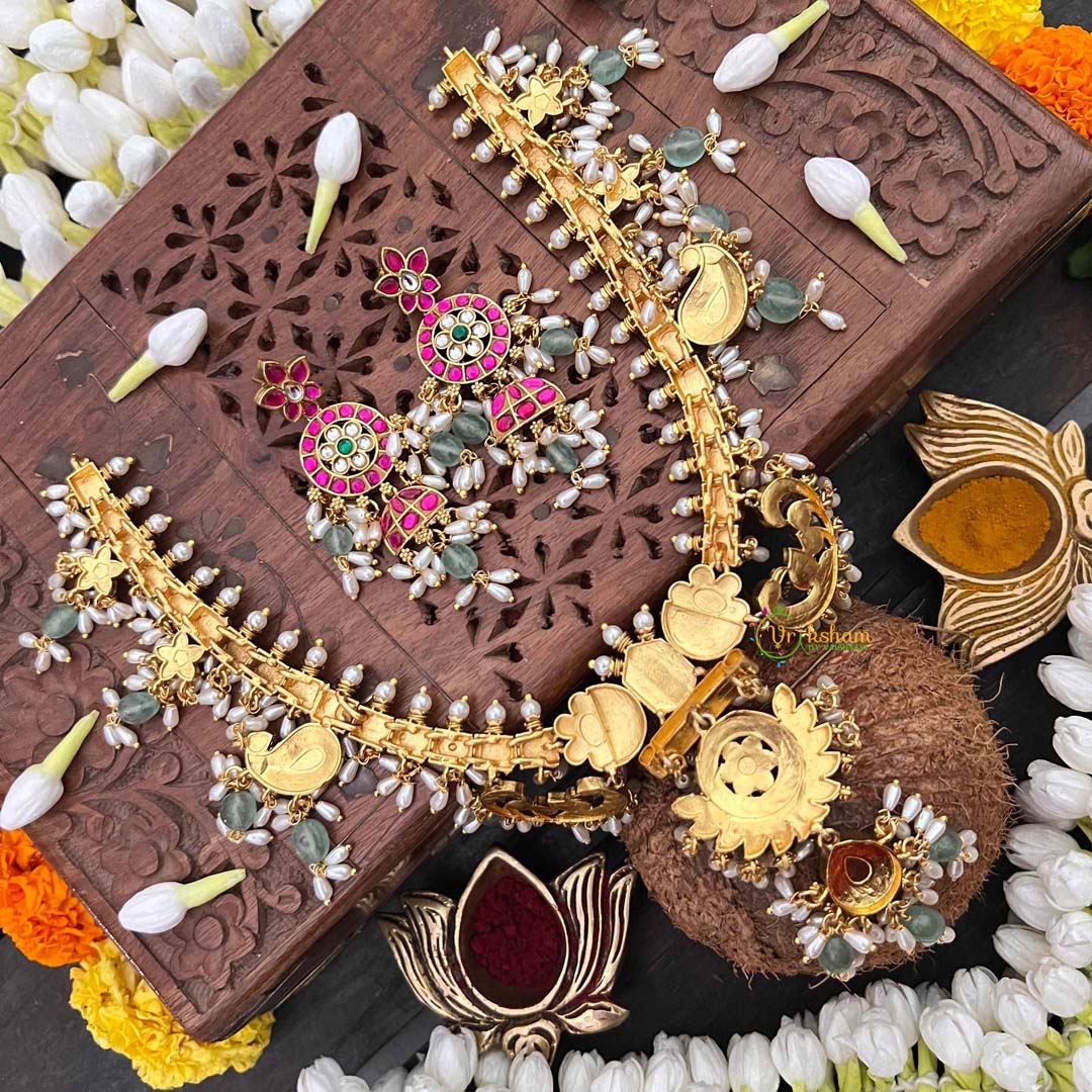 Experience the pinnacle of heritage jewelry with this Antique Floral Gold Kundan Jadau Guttapusalu Short Neckpiece, a symphony of traditional craftsmanship. Intricate mango motifs—symbols of prosperity and fertility—are delicately rendered in antique gold, adorned with lustrous rice pearls and vibrant green beads. The guttapusalu technique creates a distinctive granulated texture that catches light beautifully, while kundan jadau setting ensures each embellishment is individually secured with precision. Floral flourishes weave throughout the design, evoking timeless botanical elegance. Ideal for weddings, festive celebrations, or those who appreciate jewelry as wearable art, this short neckpiece drapes gracefully at the collarbone. A distinguished treasure for connoisseurs of authentic Indian artistry and unparalleled quality.