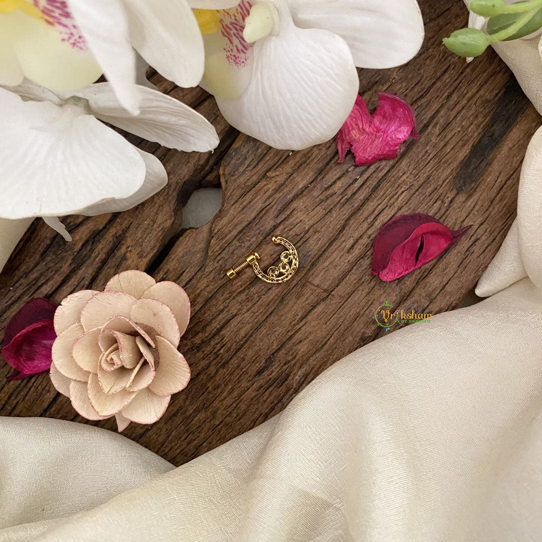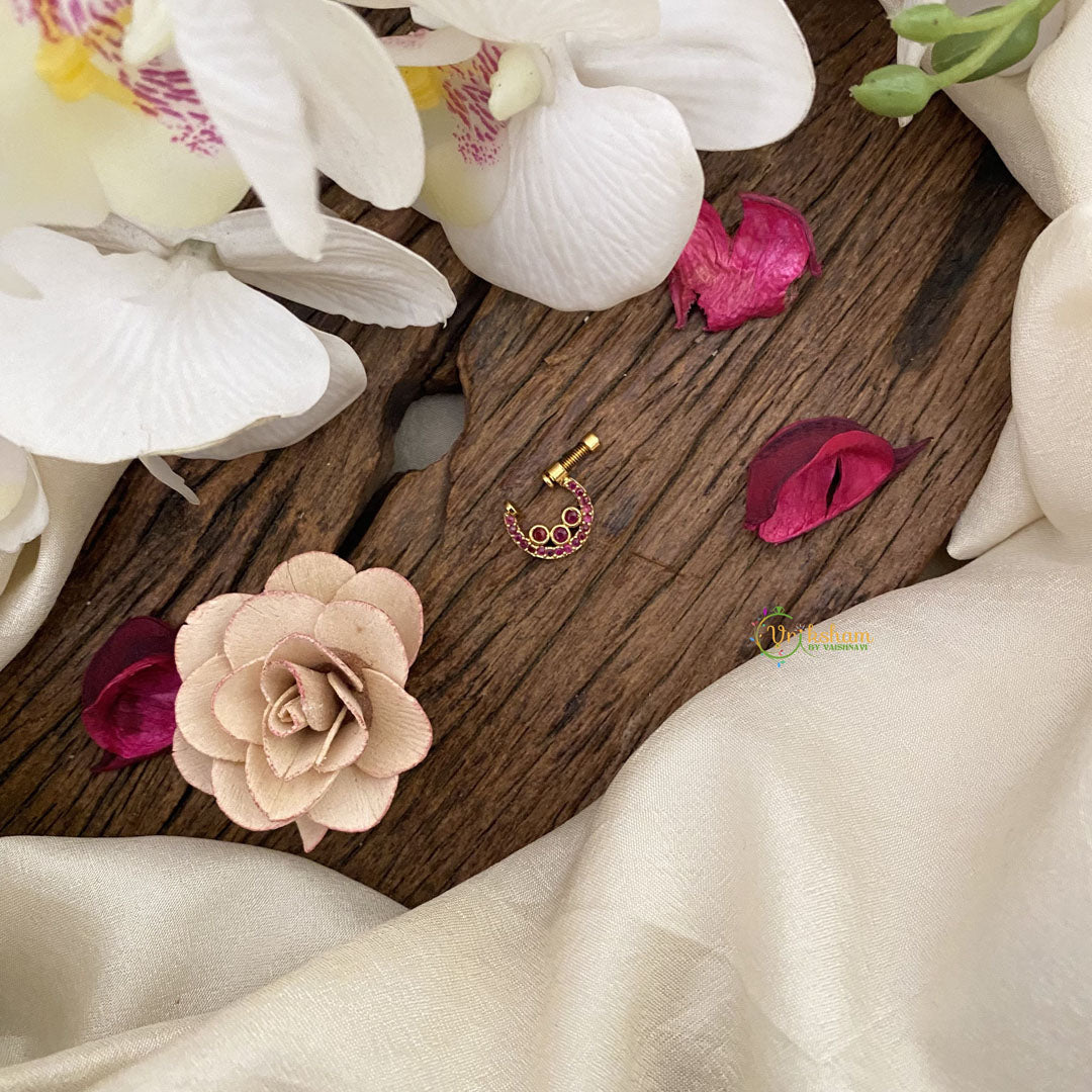 Elevate your look with Vriksham's Antique Floral Golden Naths/Nose pin in a striking red hue. Featuring delicate floral motifs and a shimmering gold finish, this exclusive piece adds a touch of vintage charm to any outfit. Indulge in luxury and make a statement with this must-have accessory.