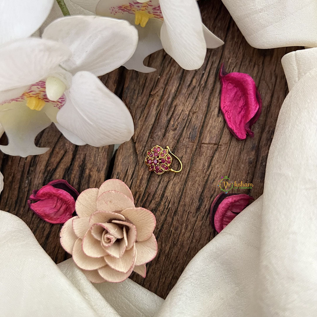 The Vriksham Antique Floral Golden Naths in vibrant red showcases intricate floral craftsmanship set in a luxurious golden finish. This elegant nose pin adds a striking yet refined accent to traditional ensembles, perfect for enhancing your look with timeless grace and sophistication on special occasions.