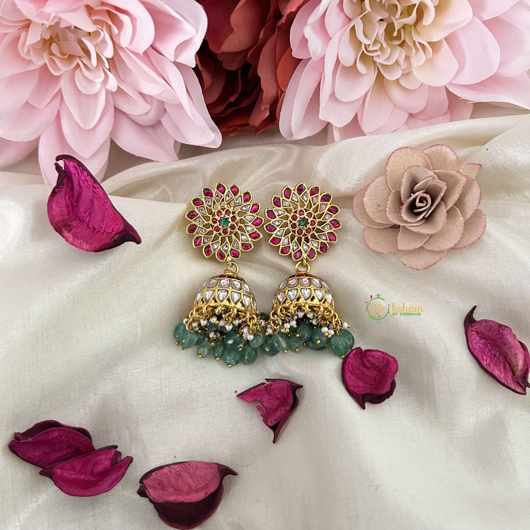 Discover the refined heritage of Vriksham's Antique Floral Jadau Kundan Jhumkas. These distinguished ornaments showcase an exquisite floral motif meticulously crafted using traditional Jadau Kundan techniques. The antiqued finish imparts a sense of cherished provenance and timeless elegance, while subtle aqua green beads and luminous pearls add dimensional depth and gentle brilliance. The classic jhumka silhouette offers graceful movement with each gesture.