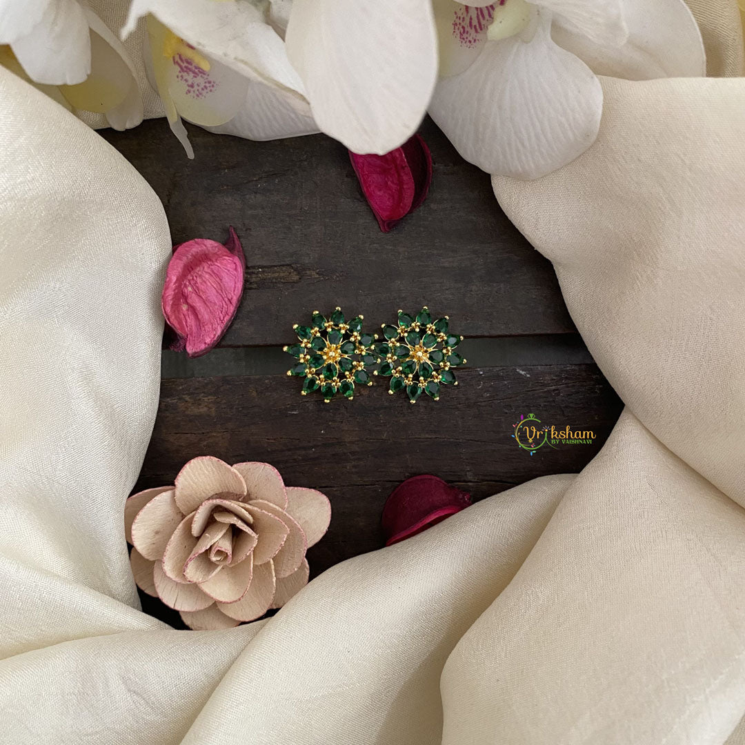 Indulge in the timeless elegance of Vriksham Antique Floral Studs-Green. These stunning, intricately designed earrings feature delicate green floral details, adding a touch of sophistication to any outfit. Handcrafted with quality materials, these studs are a luxurious addition to your jewelry collection.