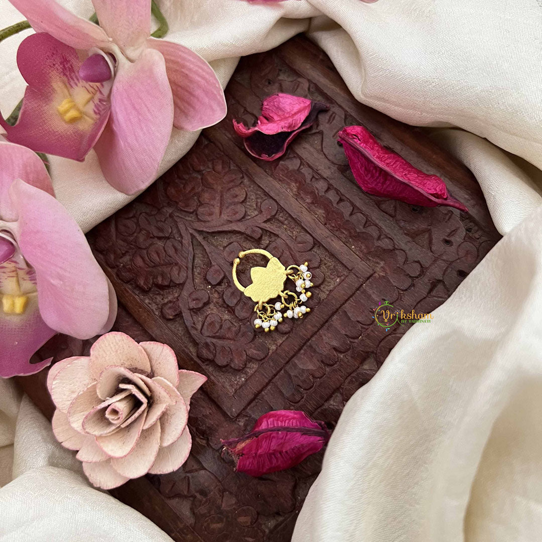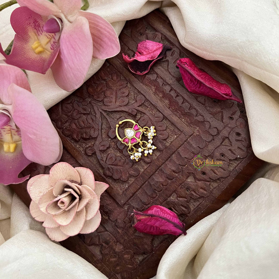 Embrace timeless elegance with this antique floral-style septum ring, crafted in gold-toned Kundan Jadau. Featuring a harmonious blend of red and white accents, its intricate design showcases exquisite craftsmanship. This piece offers a graceful, sophisticated touch, perfect for adding distinguished charm to your traditional attire.
