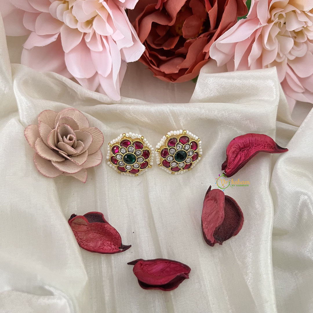 Experience the refined heritage of Vriksham's Antique Flower Jadau Kundan Stud Earrings. These distinguished ornaments showcase the timeless artistry of traditional Jadau Kundan craftsmanship, featuring an exquisite floral motif rendered in a harmonious palette of rich red, pristine white, and verdant green. The antiqued finish imparts a sense of cherished provenance and enduring elegance. Meticulously crafted for the discerning connoisseur, these earrings offer a sophisticated accent that complements both traditional ensembles and contemporary attire with understated distinction.