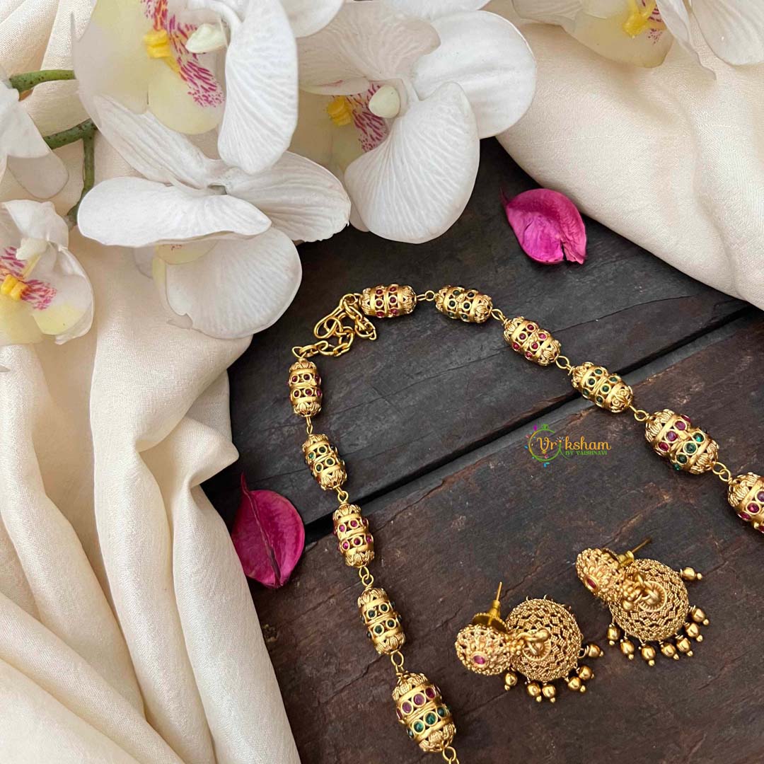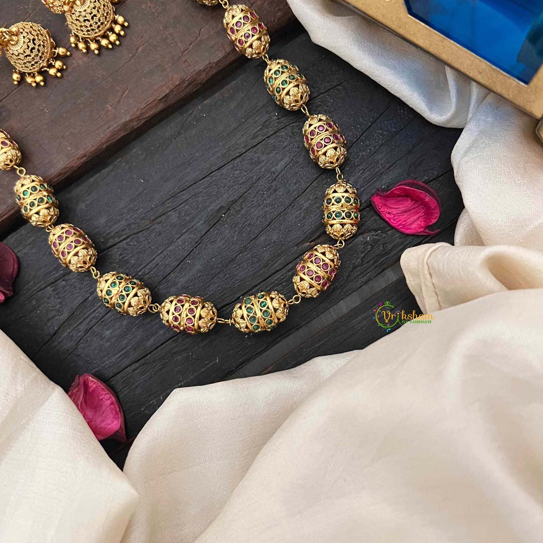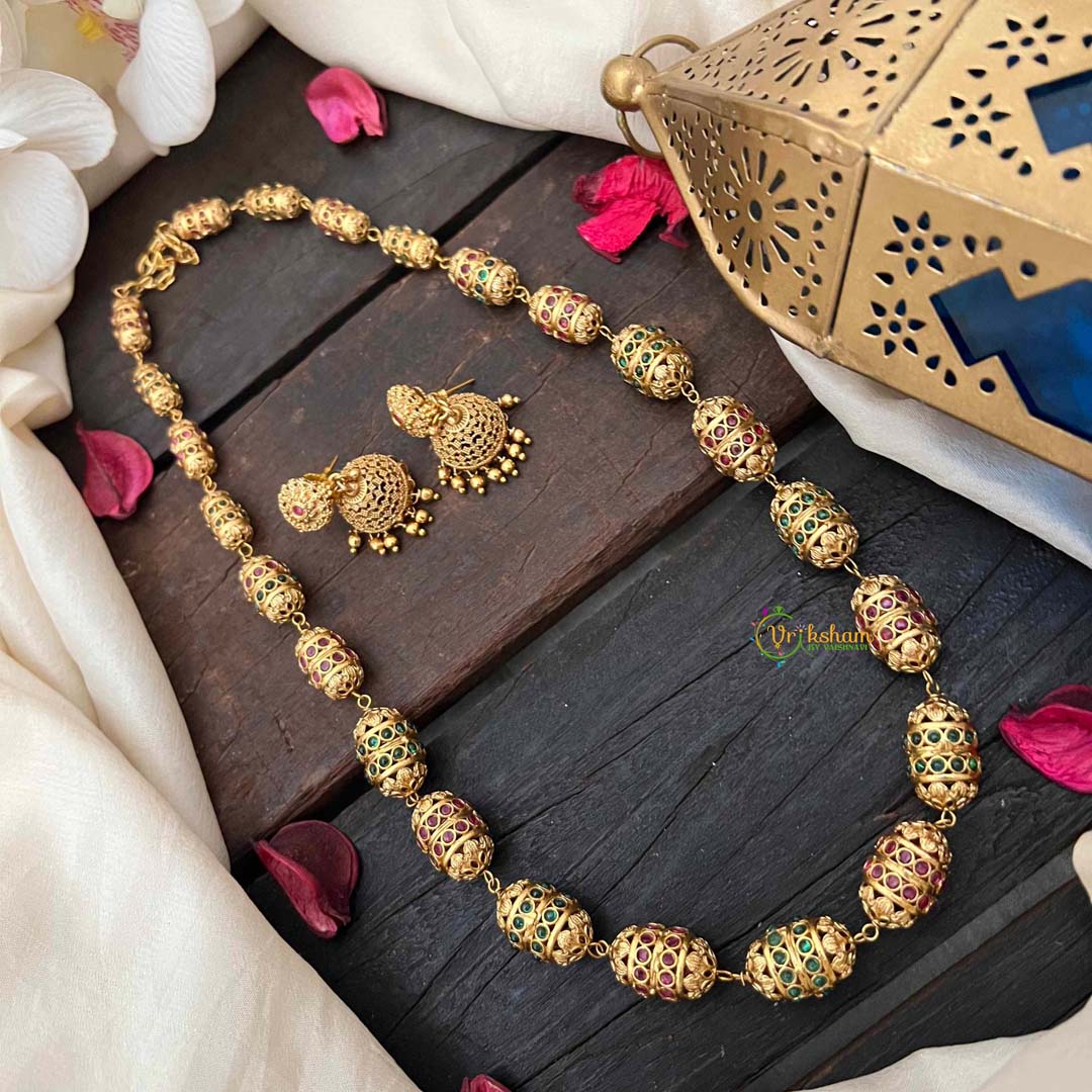 Embrace timeless elegance with this exquisite mala neckpiece, where antique gold craftsmanship meets the rich allure of ruby and emerald-inspired beads. Each barrel-shaped bead is meticulously arranged to create a harmonious blend of warmth and verdant beauty, evoking the splendor of precious gemstones. This sophisticated piece transcends occasion, serving as both a spiritual accessory and a statement of refined taste. Perfect for those who appreciate the intersection of traditional artistry and contemporary style, it drapes gracefully to complement any ensemble while honoring centuries of cultural heritage.