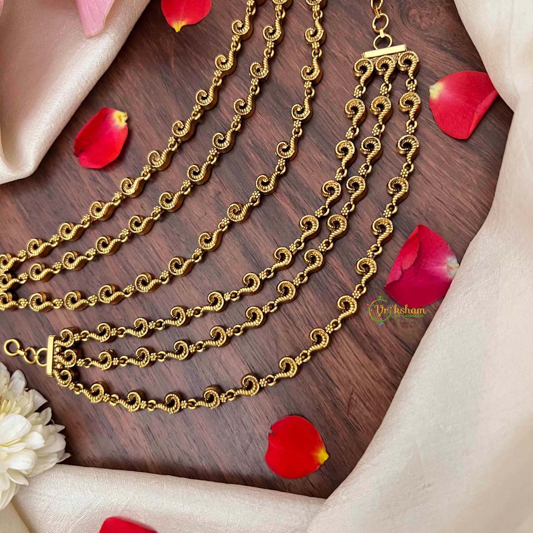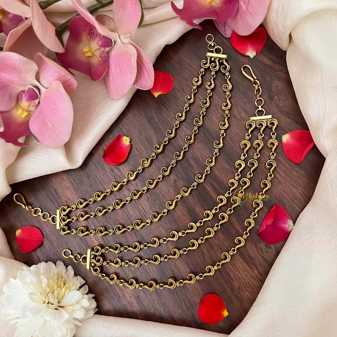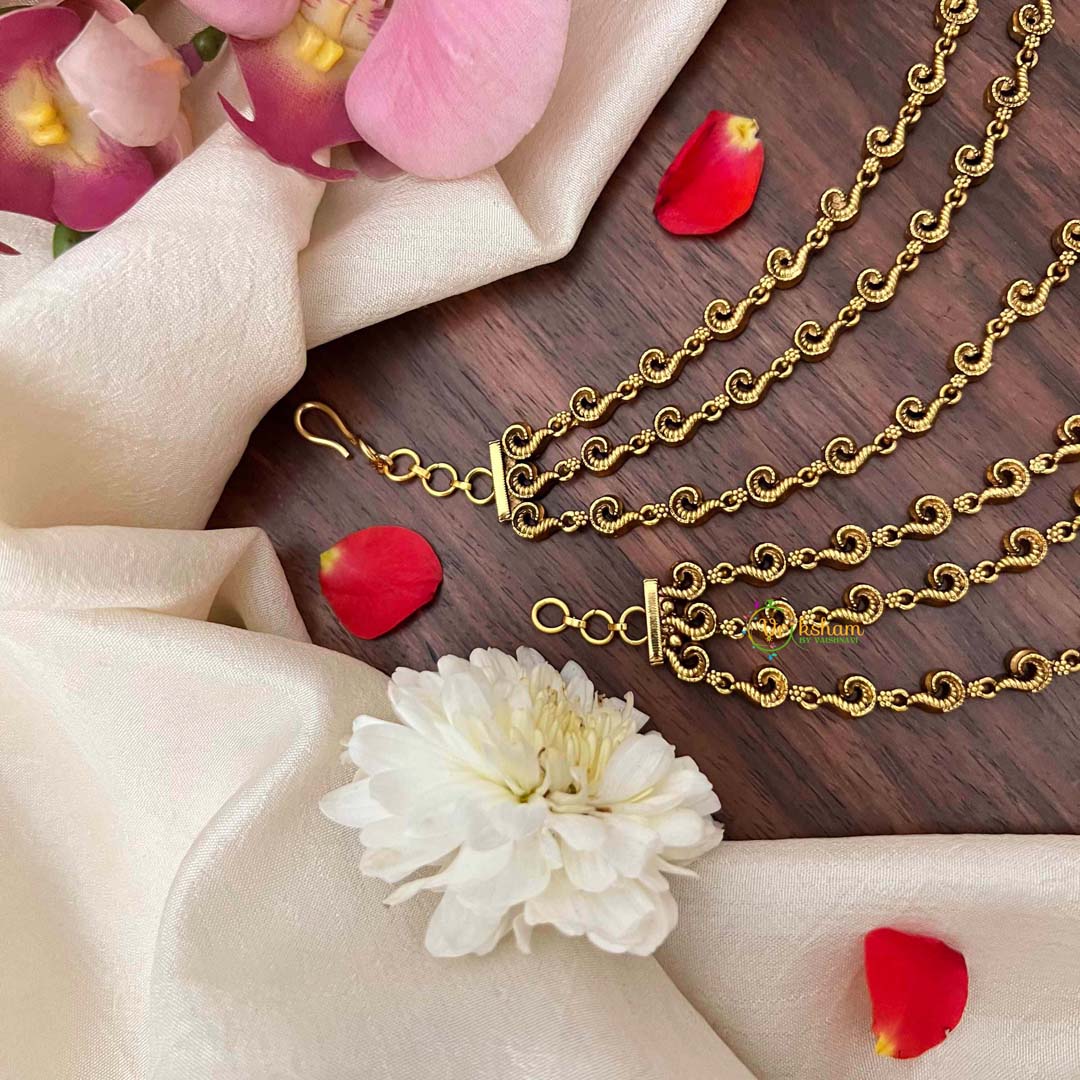 Discover timeless allure with this captivating maatil, featuring an antique gold finish that evokes vintage elegance across its three-layered design. The intricate spiral motif creates a mesmerizing visual flow, reflecting classical artistry with contemporary refinement. This piece seamlessly blends heritage craftsmanship with understated sophistication, making it ideal for festive occasions, ceremonies, and cherished celebrations. The warm, muted gold tones lend an air of distinguished grace, perfect for those who appreciate subtle beauty and cultural authenticity. A truly versatile accessory that honors tradition while exuding refined, enduring charm.