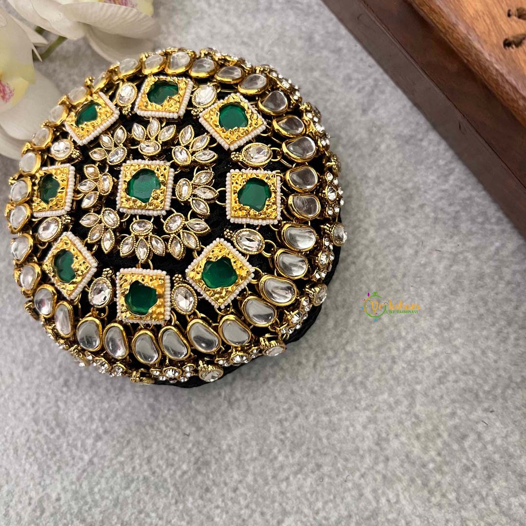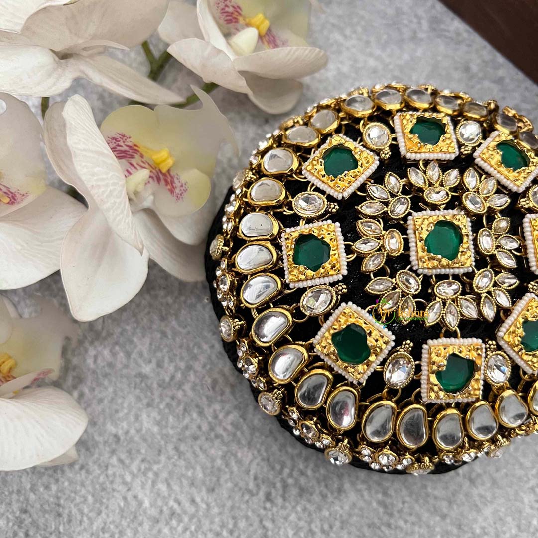 Discover timeless elegance with this antique gold-finished bun maker, featuring striking geometric green centerstones that add depth and character to your hairstyle. The warm metallic patina complements the verdant gemstones, creating a harmonious balance of classic and contemporary aesthetics. Equipped with a secure hair bun cage, this accessory provides reliable support while showcasing intricate detailing. Perfect for festive celebrations, formal events, or everyday sophistication, it transforms ordinary updos into captivating focal points. A versatile piece that resonates with those who value heritage craftsmanship and refined style.