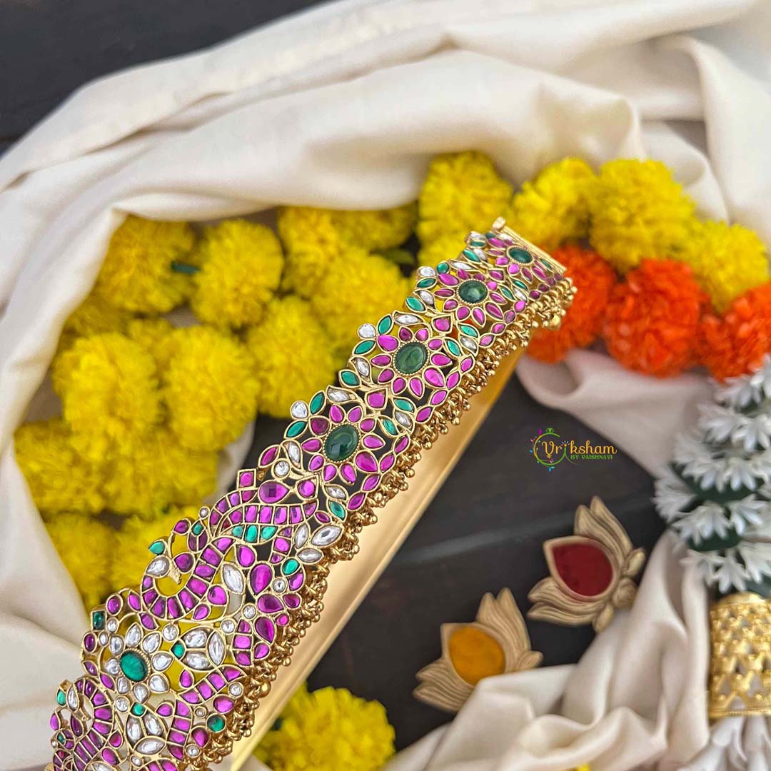 Celebrate your special day with this stunning Antique Gold Finish Peacock & Floral Bridal Hipbelt, showcasing vibrant Red, Green & White hues accented with lustrous Gold Beading. This masterpiece features intricate peacock and floral motifs rendered in antique gold, creating an opulent statement piece for weddings and grand celebrations. Crafted from natural stones and premium brass metal alloys, each detail reflects traditional artistry and meticulous handiwork. The rich antique gold patina enhances the tri-color palette, adding depth and vintage charm to your bridal look. Perfect for brides who desire ornate elegance with cultural authenticity.