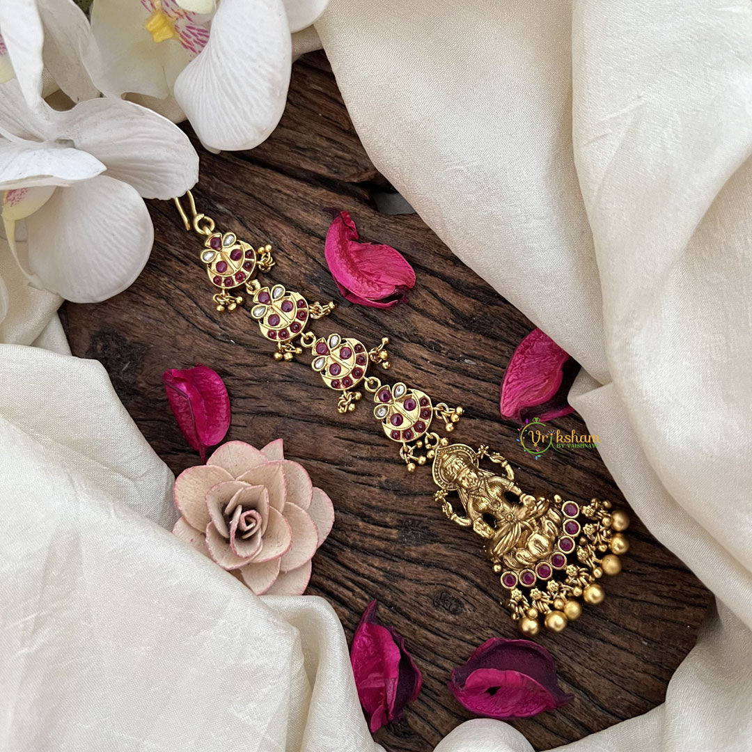 The Vriksham Antique Gold Half-Moon & Lakshmi Style Maang Tikka in Red with Gold Beads features a refined half-moon design paired with traditional Lakshmi motifs. This sophisticated piece combines antique gold tones and vibrant red accents to add a timeless and elegant touch to your ethnic ensemble, perfect for festive and ceremonial occasions.