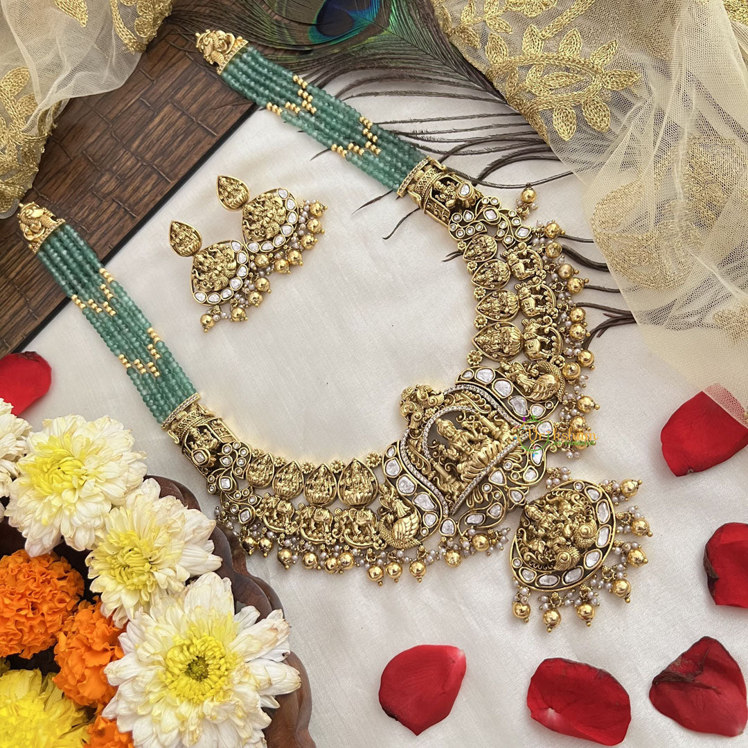The Vriksham Antique Gold Lakshmi Temple Long Necklace combines traditional charm with elegant design. Featuring a detailed Lakshmi temple pendant in antique gold finish, complemented by rich green and gold beads, this necklace offers a timeless statement piece. Its sophisticated style enhances both ethnic and contemporary outfits, perfect for special occasions or refined everyday wear.