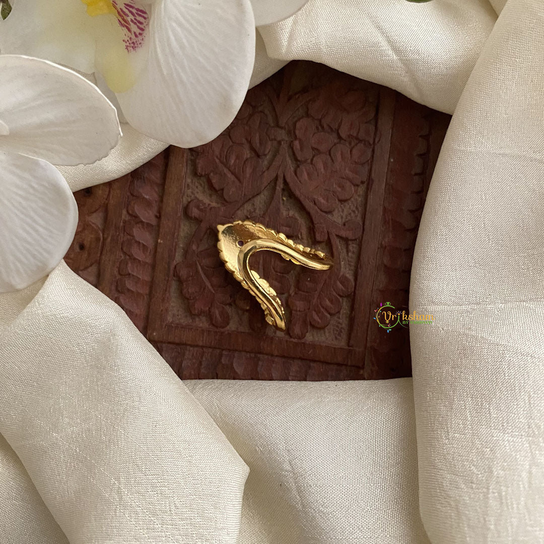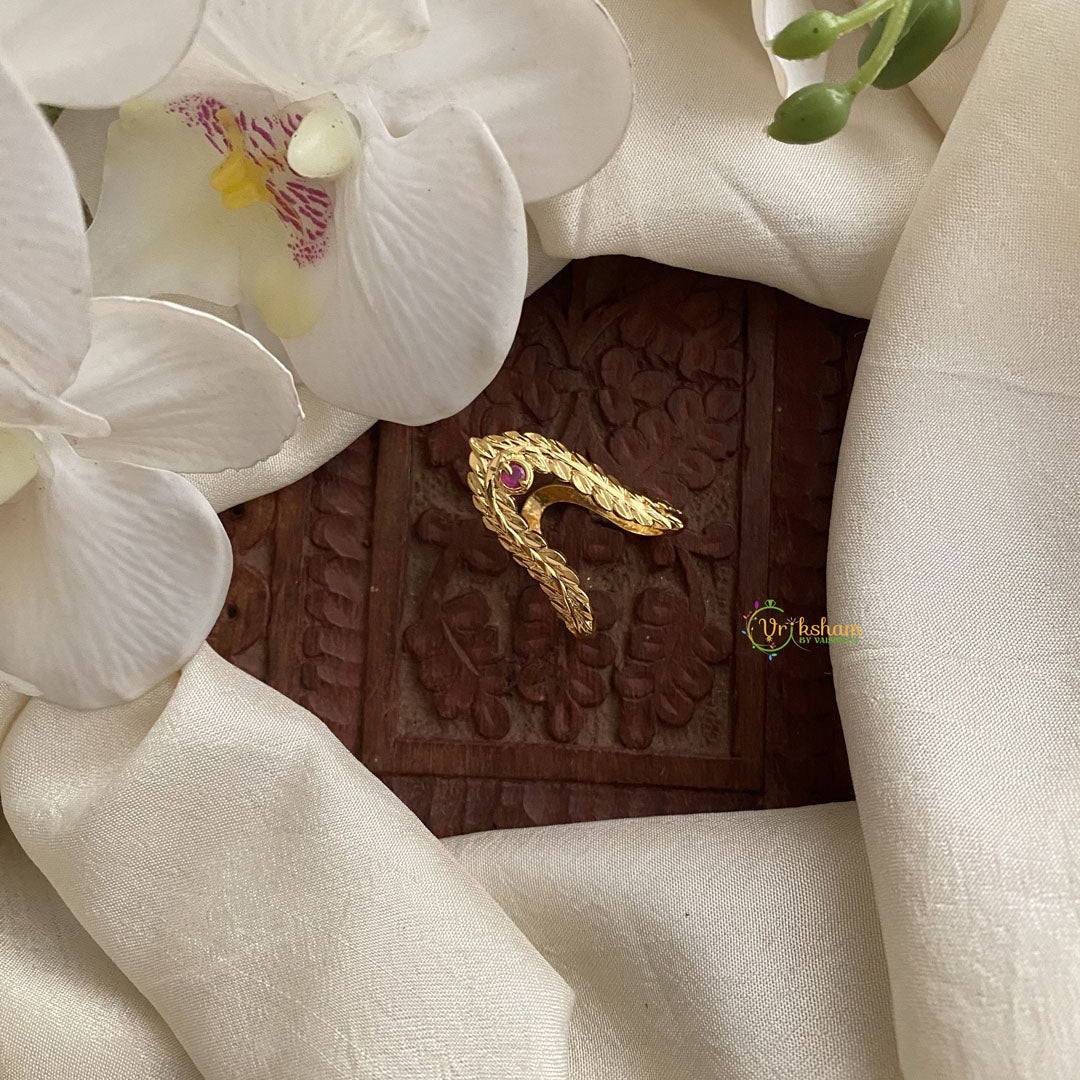 Elevate your style with our Vriksham Antique Gold Look Alike Leaf Shape Vangi Ring-Red. Crafted with exquisite detail and a luxurious finish, this stunning ring exudes sophistication and elegance. The intricate leaf shape design is reminiscent of nature's beauty, making it the perfect accessory for a fashion-forward individual. Indulge in the opulence and elevate your look with this statement piece.