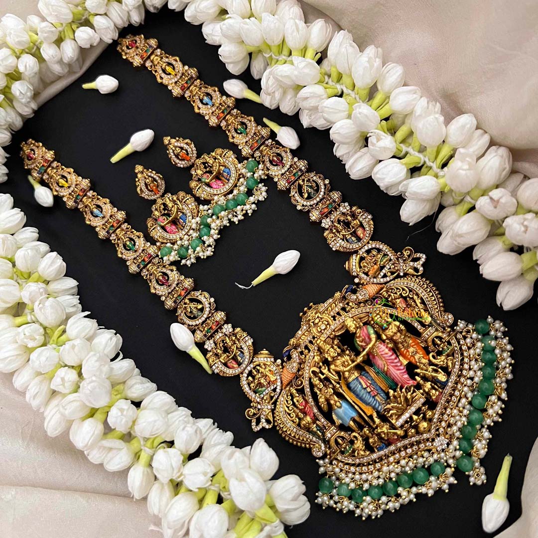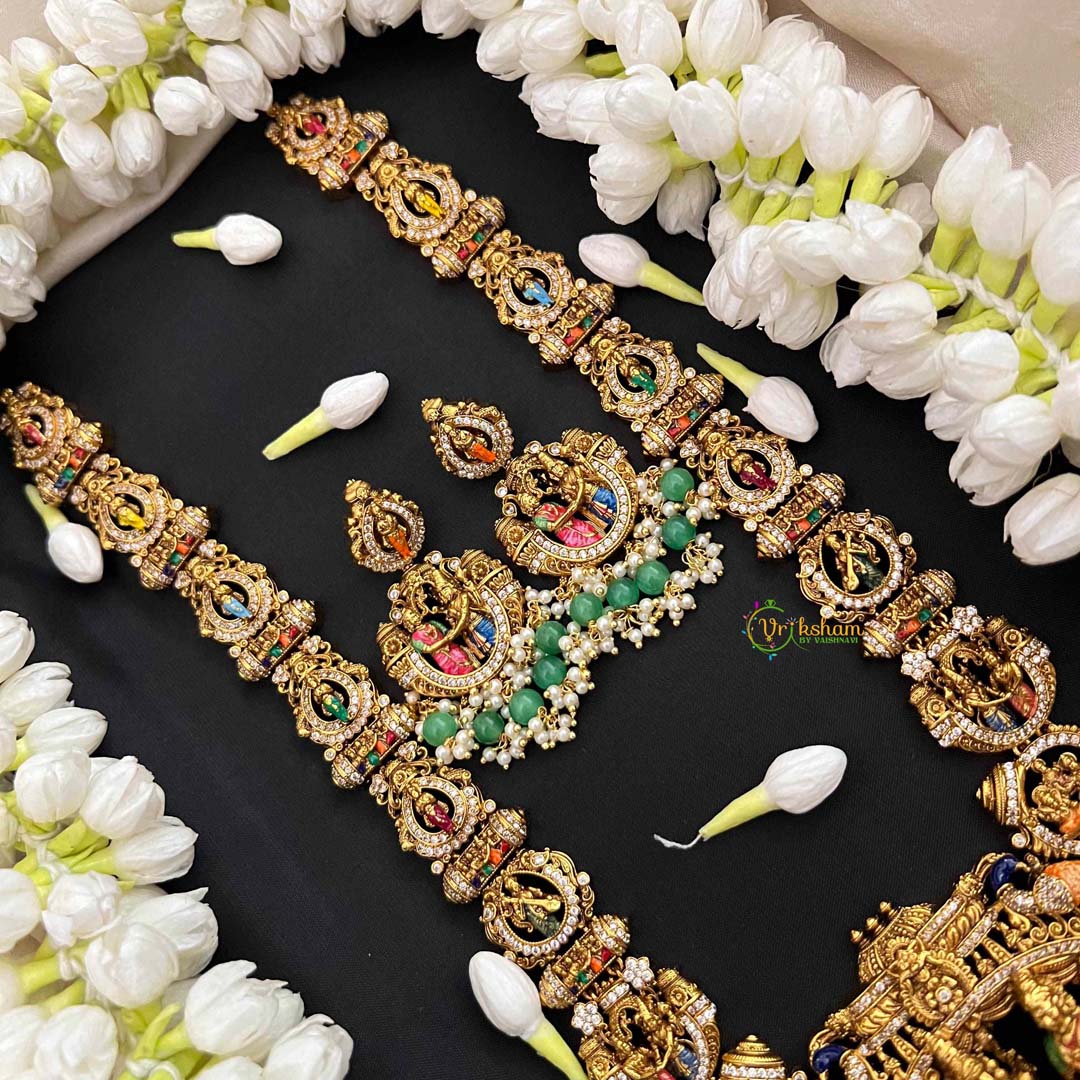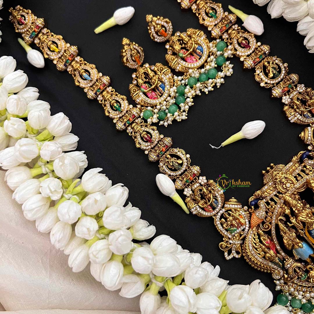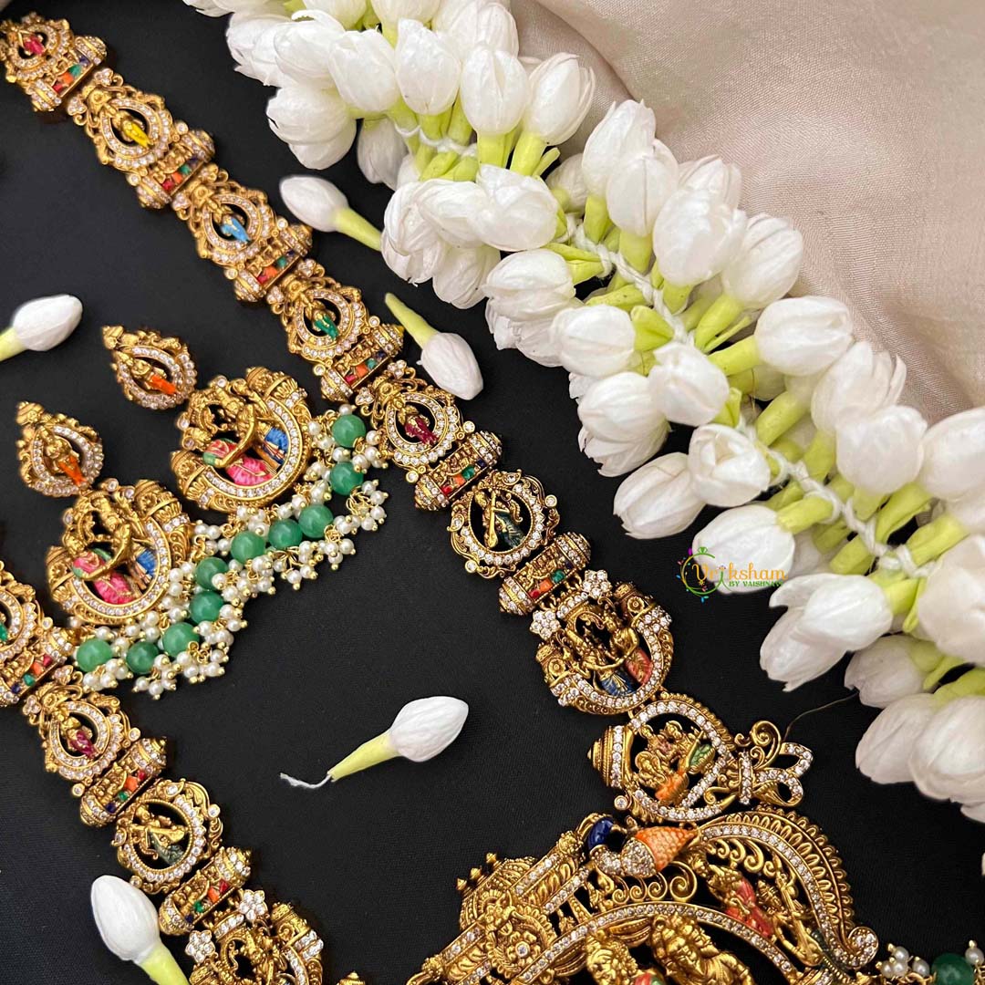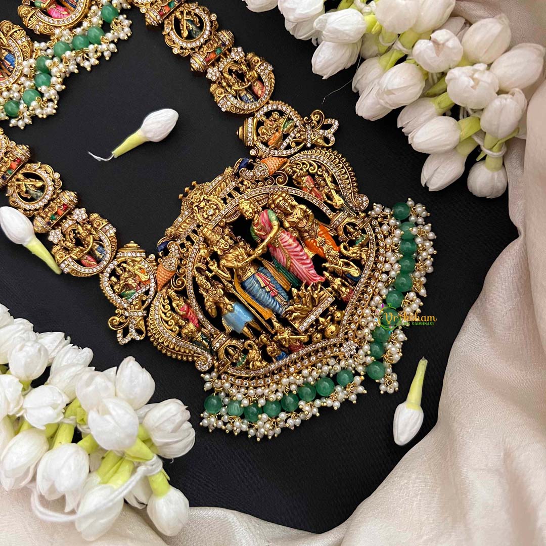 Celebrate divine elegance with this exquisite Perumal Kalynam long neckpiece, crafted in warm antique gold. Adorned with lustrous pearls and vibrant green beads, this piece seamlessly blends traditional temple jewelry aesthetics with timeless sophistication. Perfect for festive occasions, weddings, and spiritual ceremonies, it adds a touch of cultural grace to any ensemble. The intricate design and quality craftsmanship make it an heirloom-worthy addition to your jewelry collection.