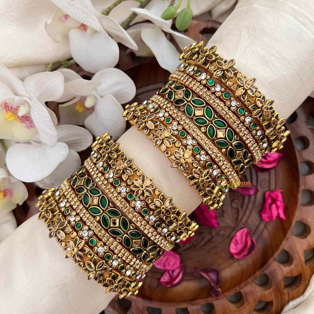 Elevate your traditional ensemble with this exquisite set of 18 antique gold-plated bangles, each adorned with intricate floral detailing and vibrant emerald green stones. Crafted with a luxurious silk base, these bangles combine timeless elegance with contemporary design, offering a harmonious blend of heritage and refinement. Perfect for weddings, festivals, or special occasions, this comprehensive collection allows you to layer and mix for personalized styling. The antique gold finish adds warmth and sophistication, while the emerald stones catch light beautifully, creating an enchanting shimmer with every movement.