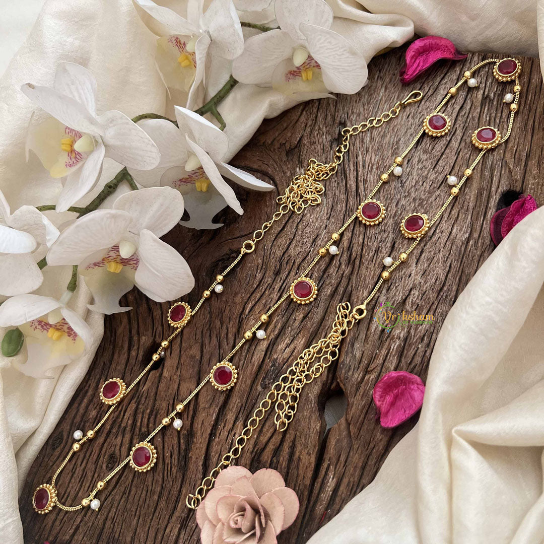 Indulge in vintage-inspired opulence with this antique gold-plated round ruby champ hipchain, a testament to timeless craftsmanship. Rich ruby-hued accents are beautifully complemented by lustrous pearls, all set against the warm patina of antique gold plating. This distinguished accessory evokes the grandeur of heritage jewelry while maintaining contemporary relevance. The circular design creates an elegant focal point that catches light with subtle sophistication, perfect for those who appreciate jewelry with depth and character. An heirloom-quality piece for the discerning individual who seeks accessories that transcend fleeting trends and embody enduring elegance.