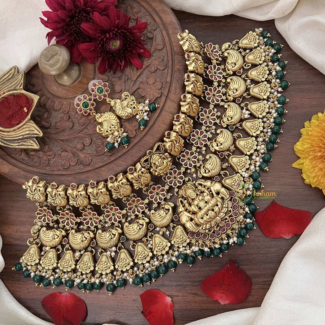 The Vriksham Antique Gold Polish Peacock Lakshmi High Neck Choker features intricate green bead and pearl accents, beautifully highlighting motifs of the peacock and Goddess Lakshmi. With its antique gold polish, this sophisticated piece blends traditional elegance and detailed craftsmanship, making it a perfect accessory to elevate your festive and formal ensembles.