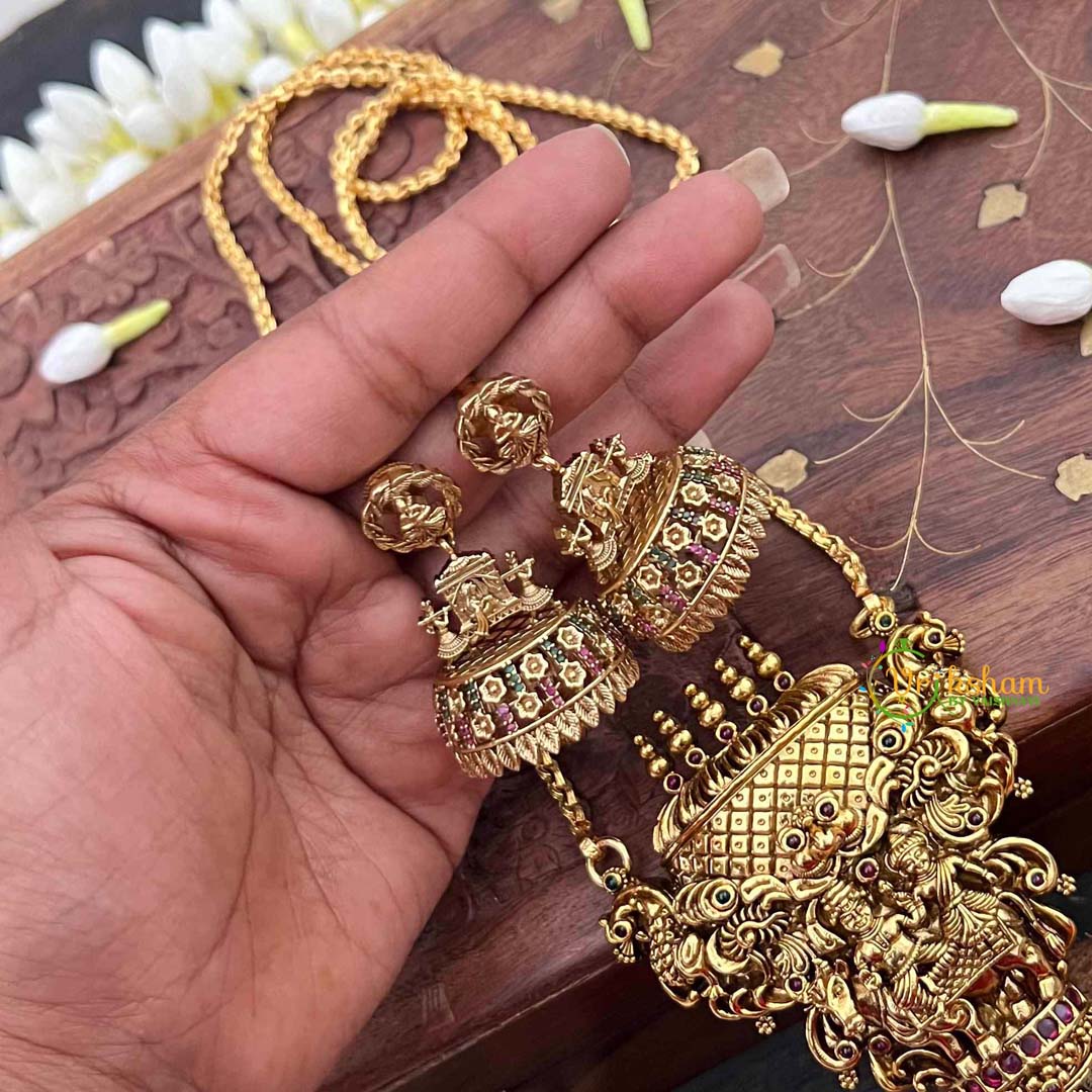 Celebrate divine union with this exquisite Antique Gold Shiv Parvati neckpiece, a harmonious blend of spiritual symbolism and refined craftsmanship. The pendant features the sacred couple rendered in warm antique gold, suspended from an elegant rope chain that drapes with graceful sophistication. Delicate jhumka drops add movement and traditional charm, creating a dynamic composition that captures attention from every angle. This extended neckpiece is an ideal choice for brides seeking meaningful jewelry that honors ancestral reverence while maintaining contemporary allure. The antique finish lends an heirloom quality, perfect for weddings, festivals, and moments when you wish to carry divine blessings close to your heart.
