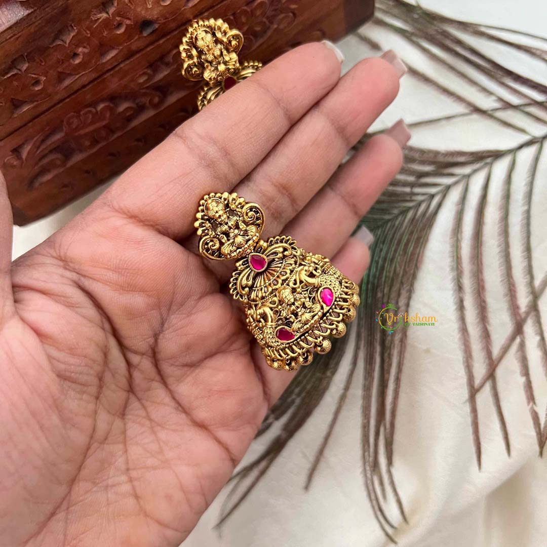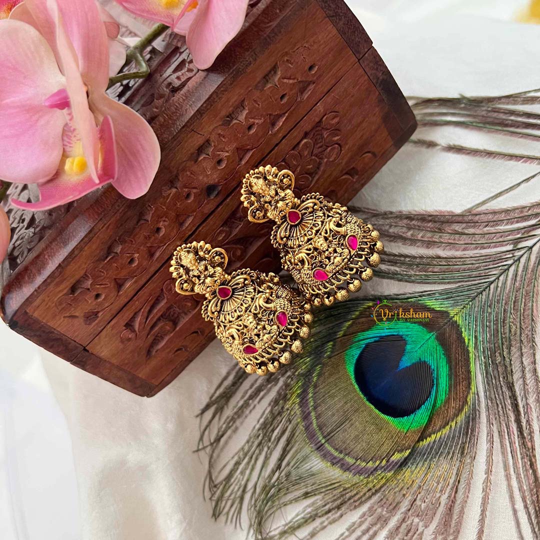 Embrace divine elegance with these exquisite temple Lakshmi jhumka earrings, rendered in lustrous antique gold with striking red gemstone embellishments. Inspired by sacred temple jewelry traditions, each piece features intricate gold bead work that captures the essence of timeless craftsmanship. These sophisticated earrings are a testament to cultural heritage, perfect for special celebrations or those who cherish meaningful, ornate jewelry with spiritual significance.
