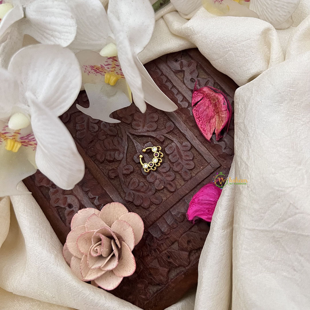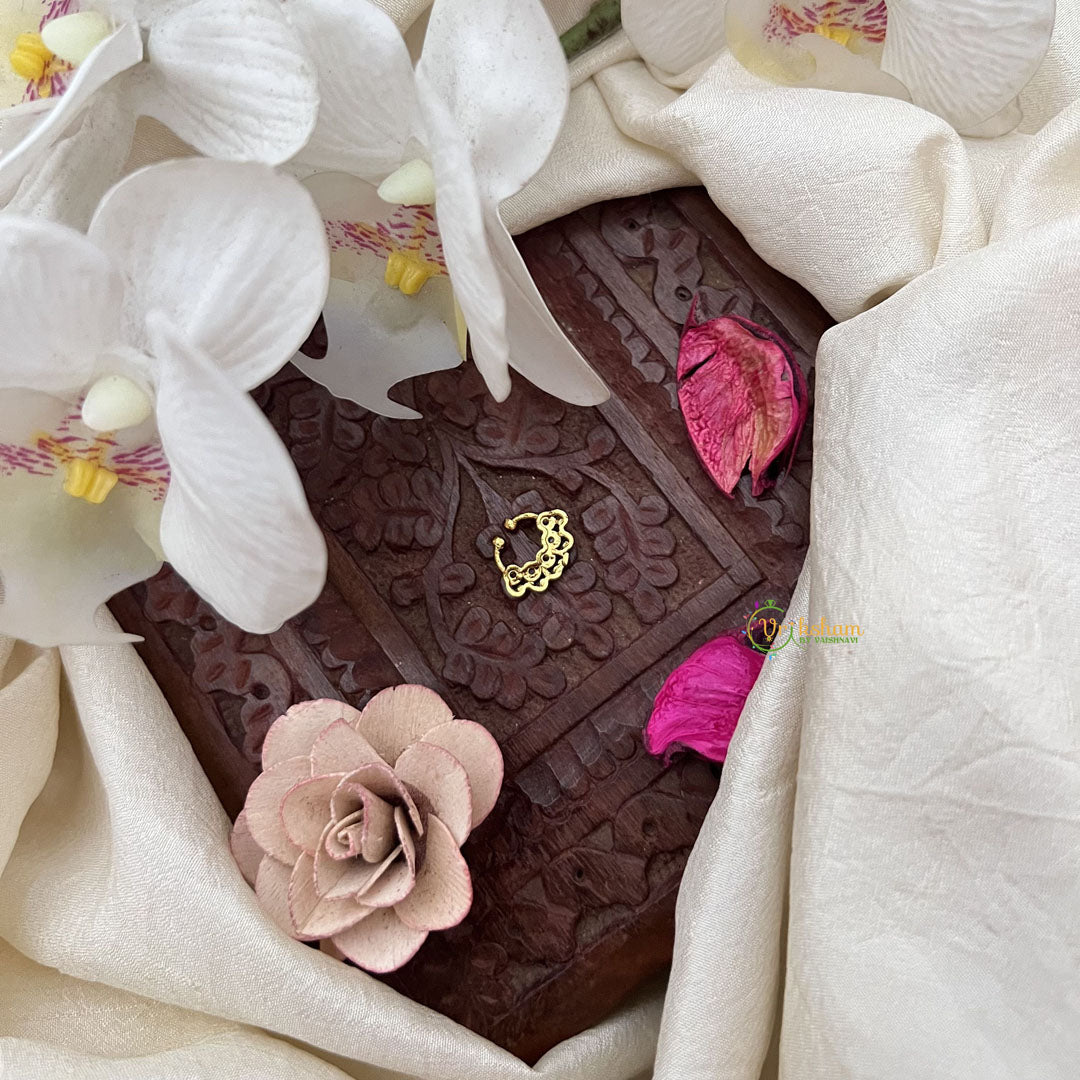 The Vriksham Antique Gold Work Septum Ring in red and white features exquisite craftsmanship with a rich antique gold finish, enhanced by contrasting red and white accents. This elegant piece offers a refined blend of vintage charm and subtle color detail, perfect for adding a sophisticated touch to your ensemble.