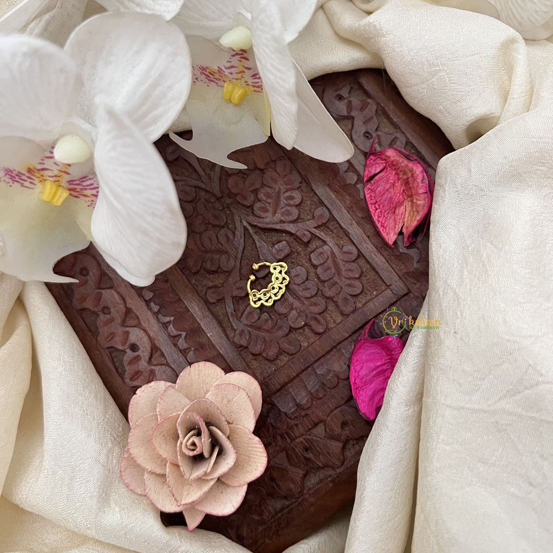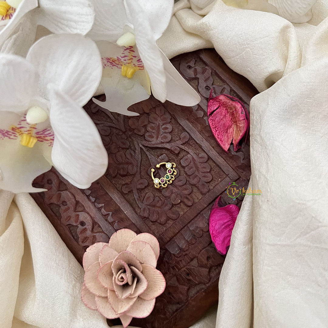 The Vriksham Antique Gold Work Septum Ring in red, white, and green showcases masterful antique gold craftsmanship accented by vibrant tri-color detailing. This elegant piece balances traditional design with refined color contrasts, making it a sophisticated accessory to enhance any ensemble.