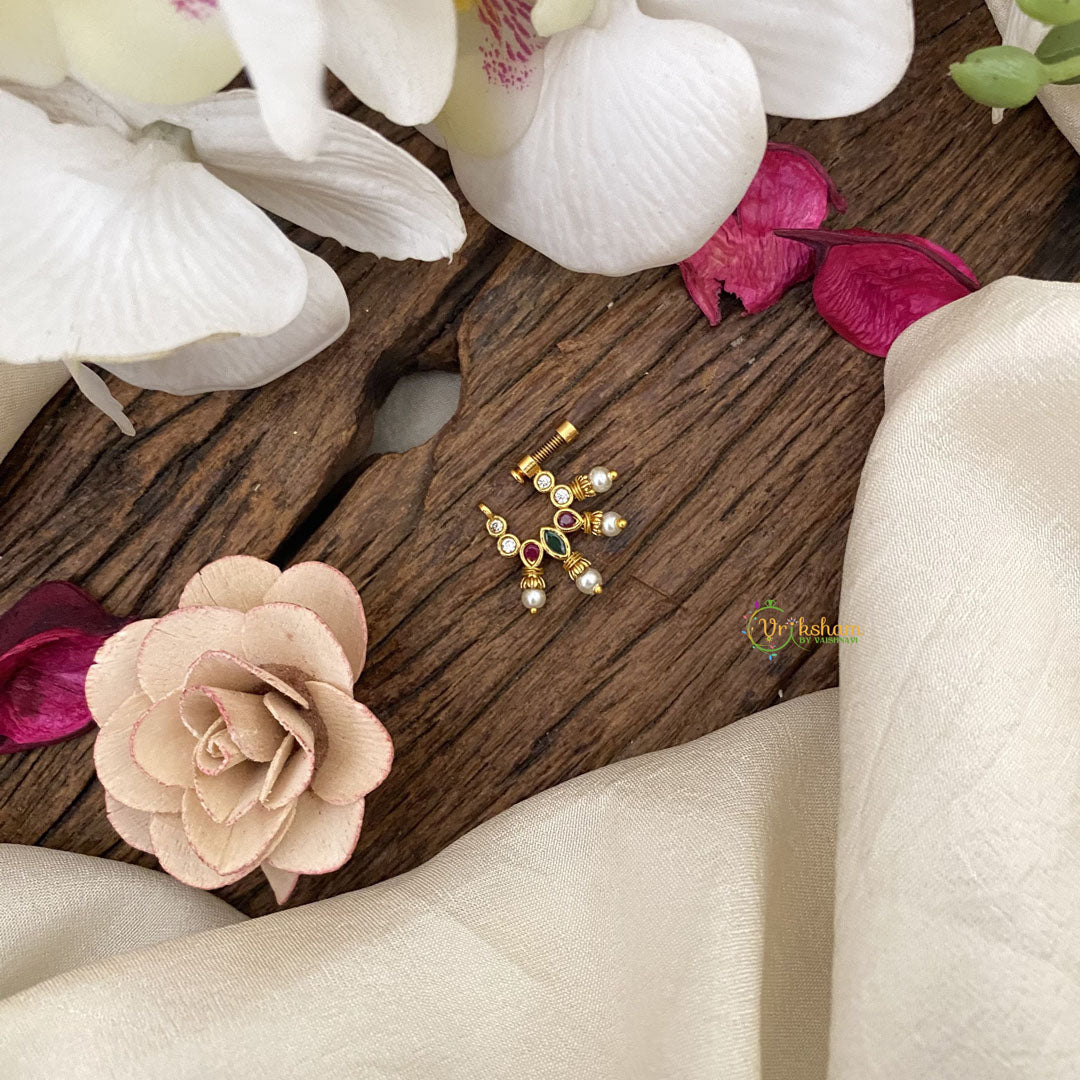 Introducing the Vriksham Antique Golden Look Alike Naths/Nose pin in Pearl-Red Green & White-G17511. This exquisite accessory is crafted with a luxurious and intricate design, reminiscent of vintage royalty. Adorned with pearls and a striking red embellishment, it perfectly accentuates any traditional ensemble. Elevate your style and make a statement with this one-of-a-kind piece.
