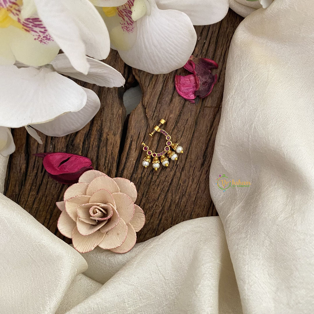 Adorn your nose with the exquisite Vriksham Antique Golden Naths/Nose pin. Made with intricate details and adorned with a delicate pearl and vibrant red stone, this nose pin exudes luxury and sophistication. Embrace a regal touch to your look with this elegant accessory.
