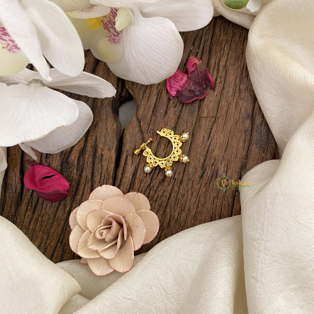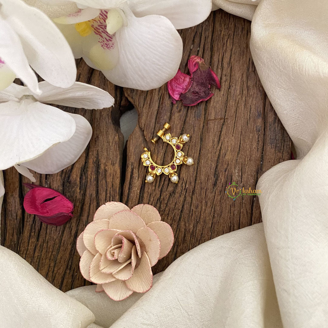Accentuate your elegance with Vriksham's Antique Golden Naths/Nose pin embellished with a single pearl in timeless red white. Elevate your look with this sophisticated and exclusive accessory, inspired by the world of art and luxury. Perfect for any occasion, this piece will add a touch of tastefulness and refinement to your ensemble.