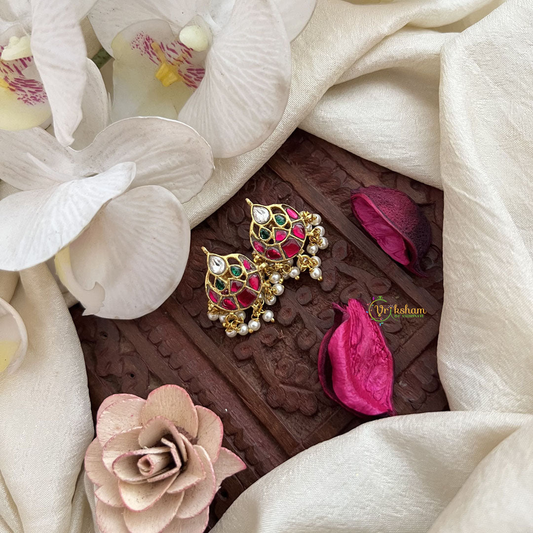 The Vriksham Antique Half Circle Pear Drop Style Jadau Press Bugadi in red, green, and white, accented with pearls, features a classic half-circle design complemented by elegant pear drop details. Crafted with intricate kundan and jadau artistry, this sophisticated accessory adds timeless charm and refined elegance to traditional attire, perfect for special occasions.