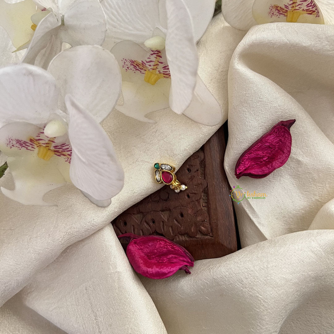 Indulge in luxury and elegance with the Vriksham Antique Jadau Kundan Nath. Adorned with intricate red green & white pearls, this exquisite piece adds a touch of sophistication to any outfit. Embrace the art of fashion with this timeless accessory.